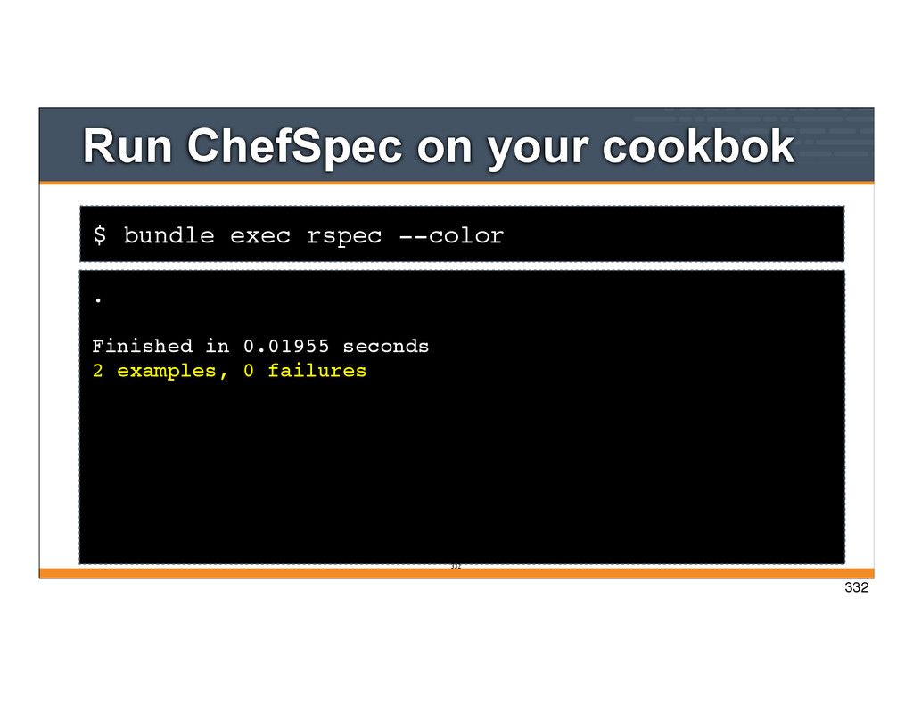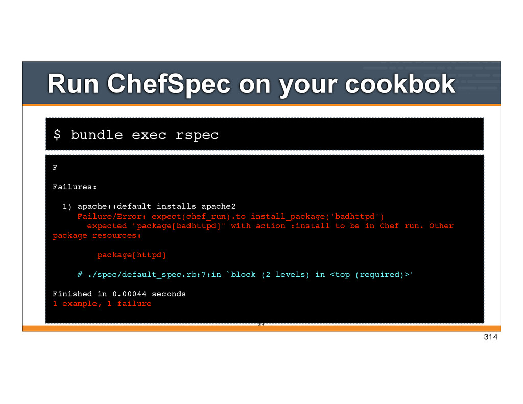 = ChefSpec::Runner.new.converge('apache::default') it 'installs apache2' do expect(chef_run).to install_package('httpd') end end Test apache::default recipe 310 310