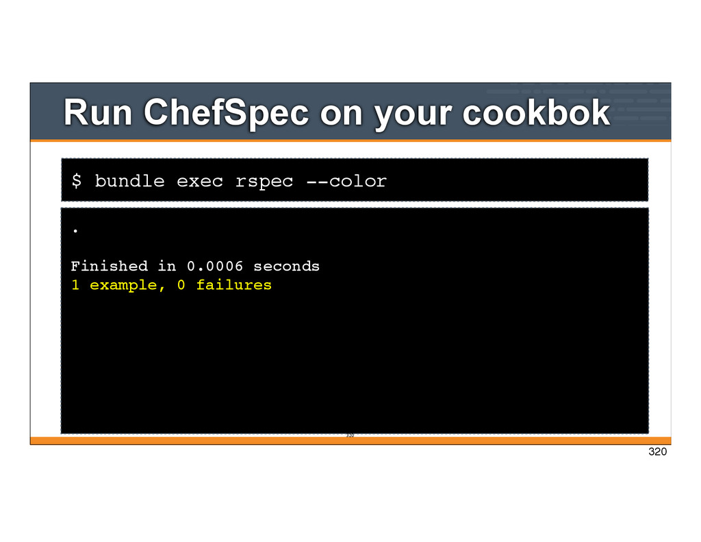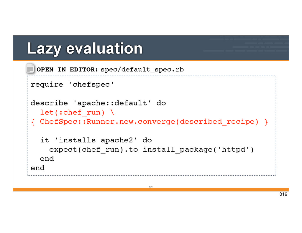 \ { ChefSpec::Runner.new.converge(described_recipe) } it 'installs apache2' do expect(chef_run).to install_package('httpd') end end Lazy evaluation 319 319