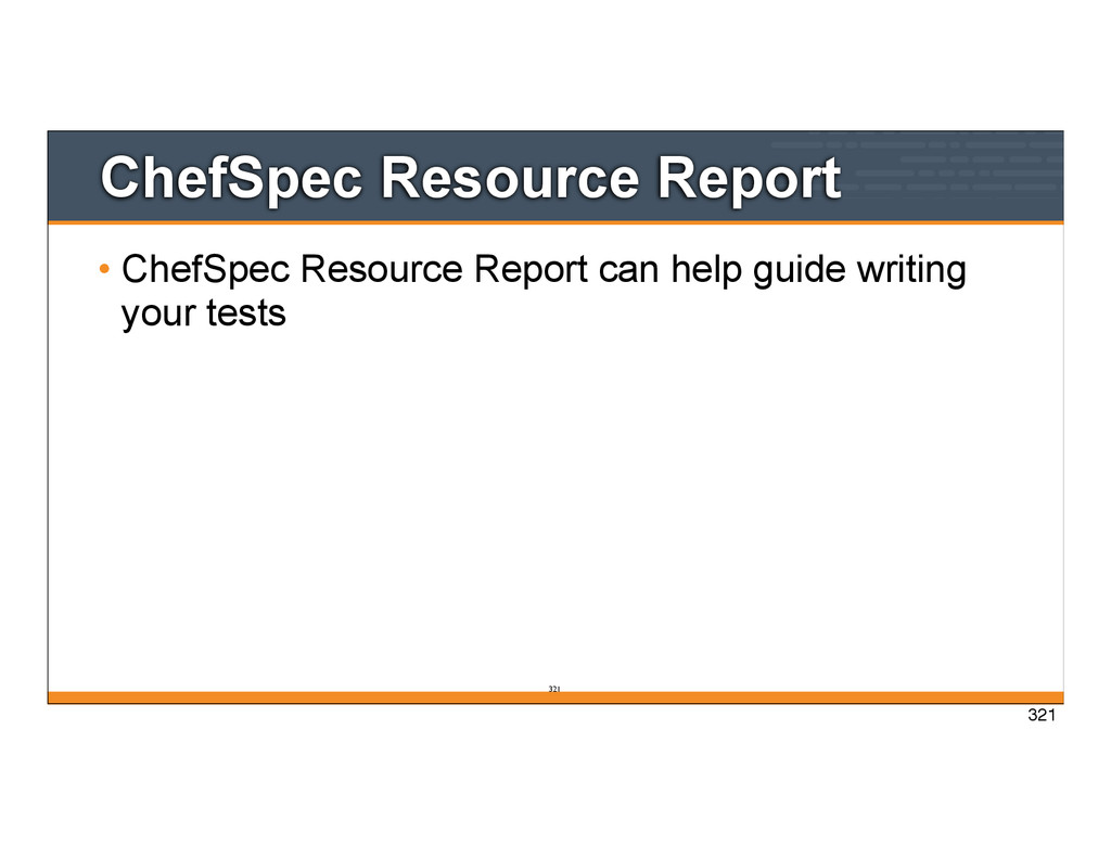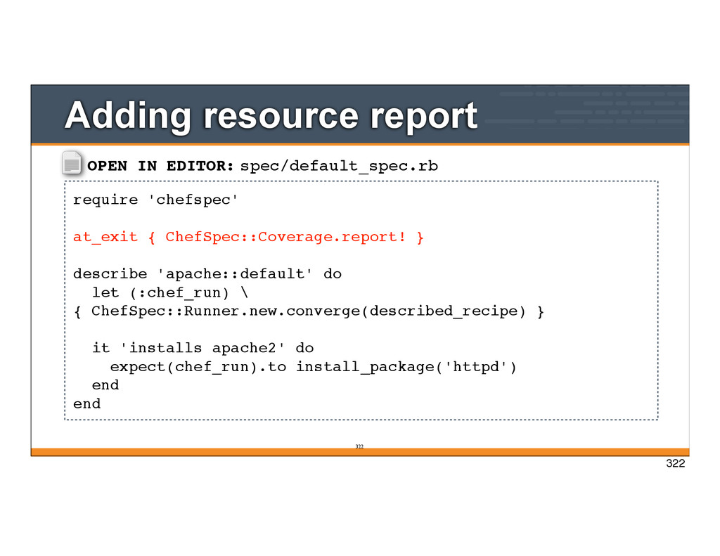 describe 'apache::default' do let (:chef_run) \ { ChefSpec::Runner.new.converge(described_recipe) } it 'installs apache2' do expect(chef_run).to install_package('httpd') end end Adding resource report 322 322