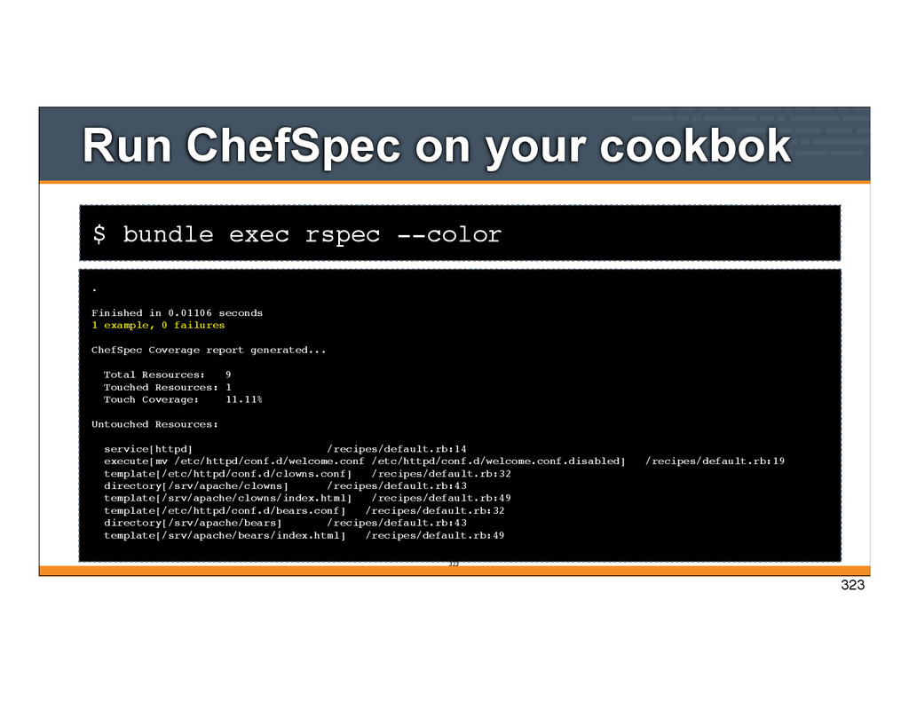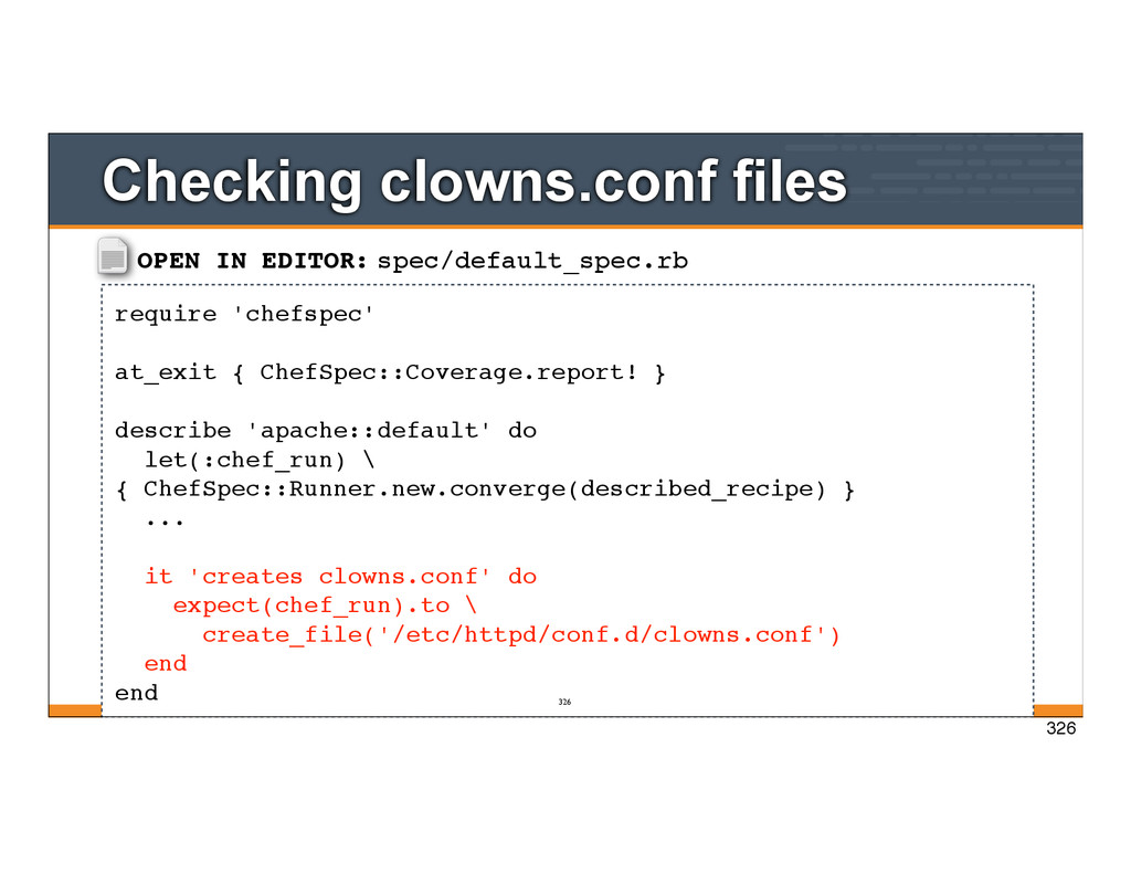describe 'apache::default' do let(:chef_run) \ { ChefSpec::Runner.new.converge(described_recipe) } ... it 'creates clowns.conf' do expect(chef_run).to \ create_file('/etc/httpd/conf.d/clowns.conf') end end Checking clowns.conf files 326 326