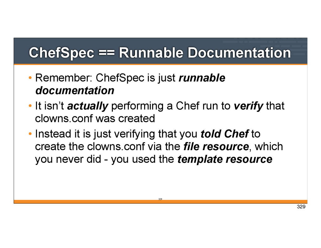 runnable documentation • It isn’t actually performing a Chef run to verify that clowns.conf was created • Instead it is just verifying that you told Chef to create the clowns.conf via the file resource, which you never did - you used the template resource 329