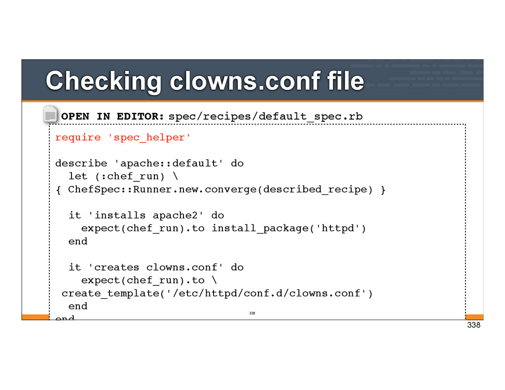 (:chef_run) \ { ChefSpec::Runner.new.converge(described_recipe) } it 'installs apache2' do expect(chef_run).to install_package('httpd') end it 'creates clowns.conf' do expect(chef_run).to \ create_template('/etc/httpd/conf.d/clowns.conf') end end Checking clowns.conf file 338 338