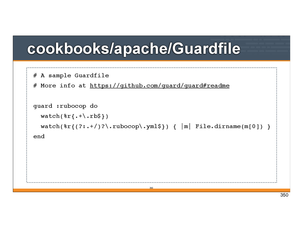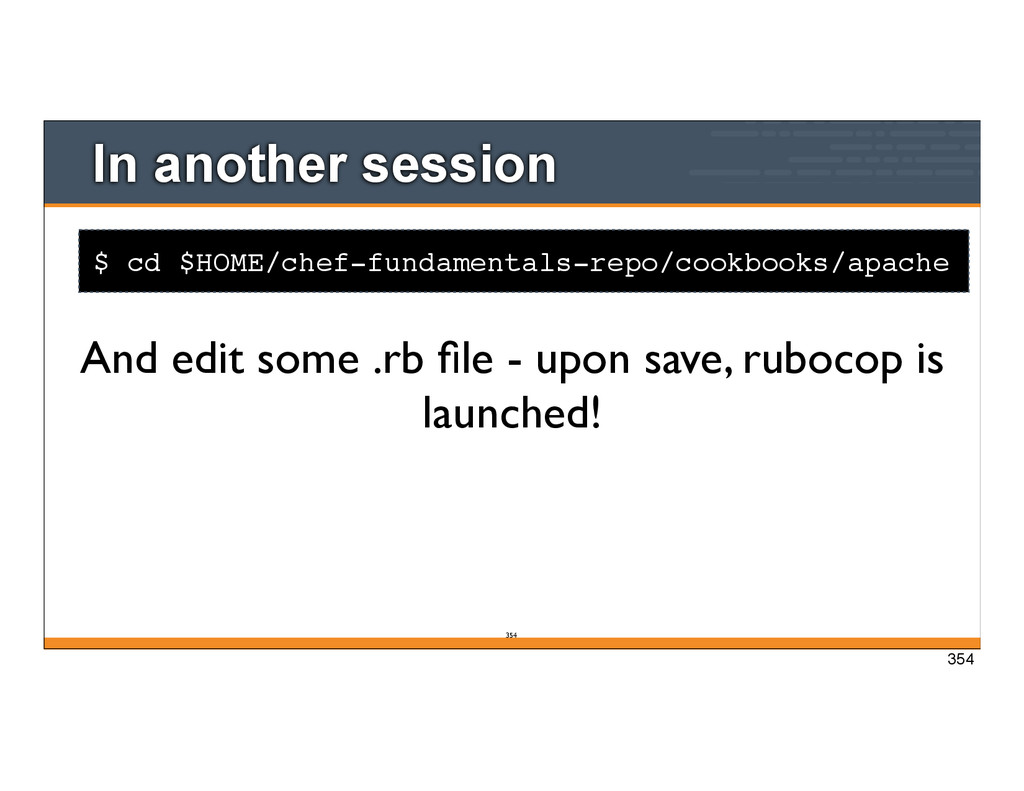 - Writing new Guardfile to /home/vagrant/ chef-fundamentals-repo/cookbooks/apache/Guardfile 02:45:32 - INFO - rubocop guard added to Guardfile, feel free to edit it 349 349