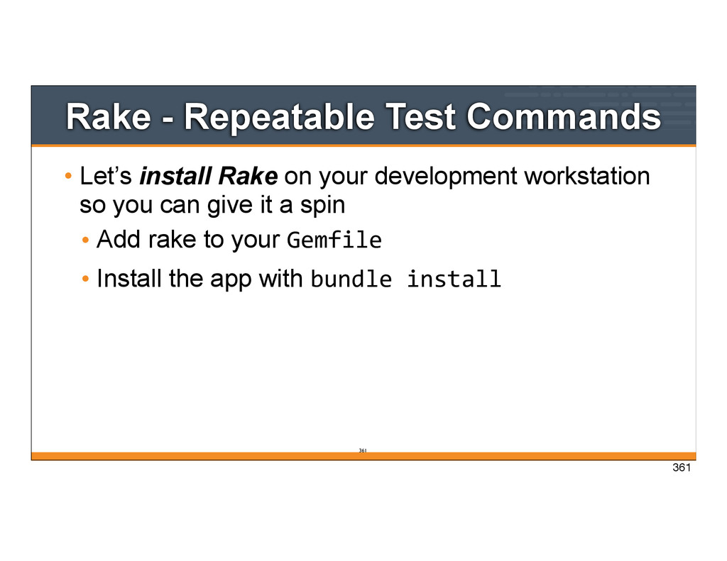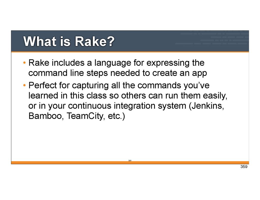 the command line steps needed to create an app • Perfect for capturing all the commands you’ve learned in this class so others can run them easily, or in your continuous integration system (Jenkins, Bamboo, TeamCity, etc.) 359 359