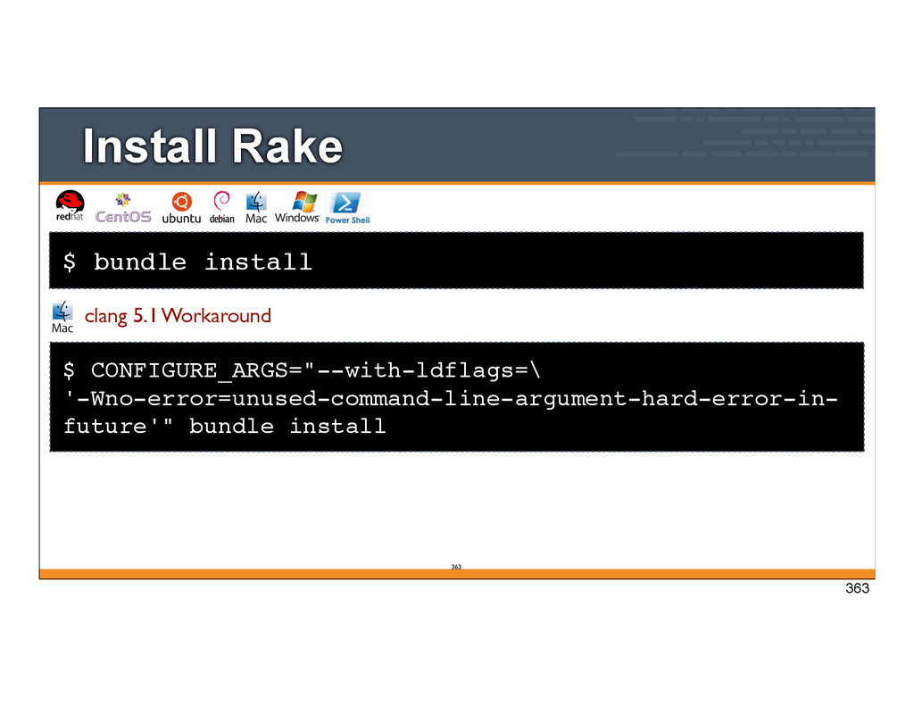 Rubocop' task :rubocop do sh 'bundle exec rubocop' end require 'foodcritic' desc 'Run Chef style checks with Foodcritic' FoodCritic::Rake::LintTask.new(:foodcritic) do |t| t.options = { tags: ['~FC003'], excludes: ['test', 'spec', 'features'] } end Workaround - Use Ruby 378 378