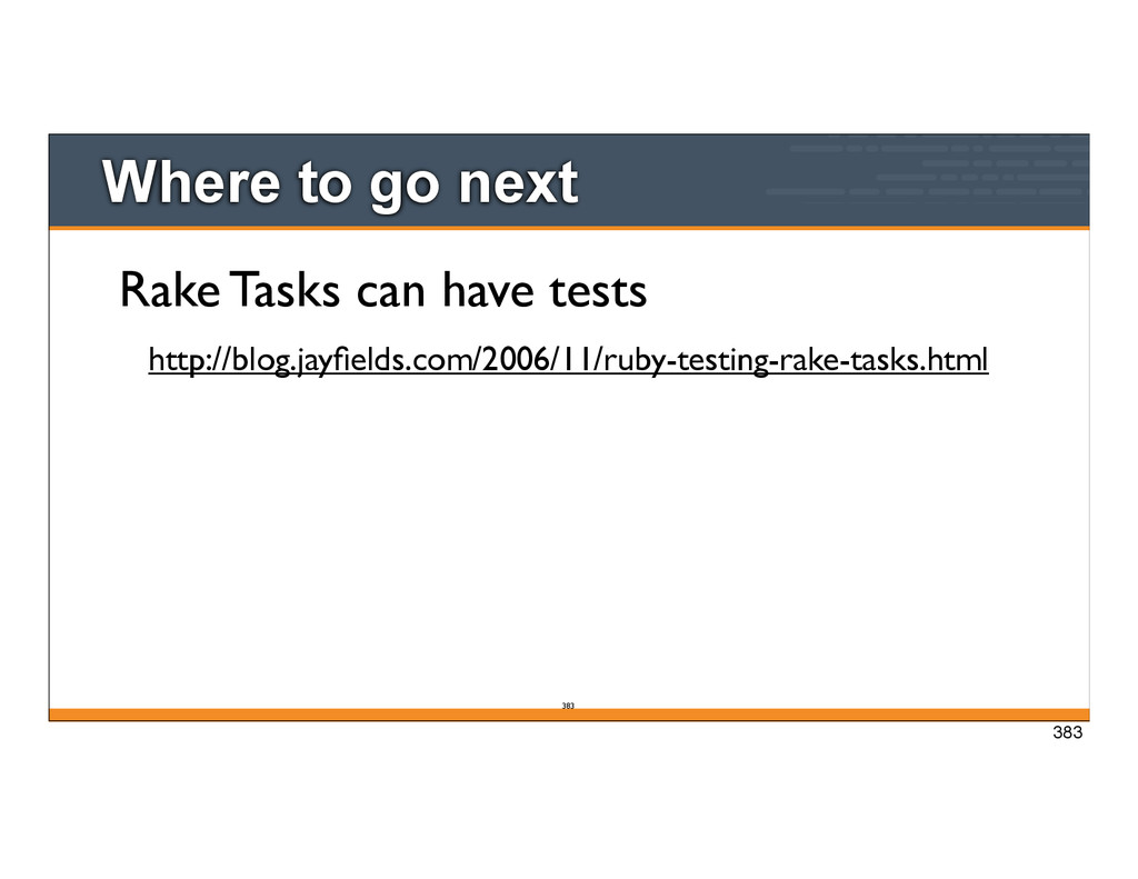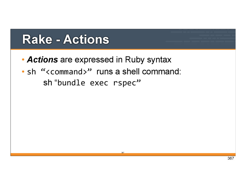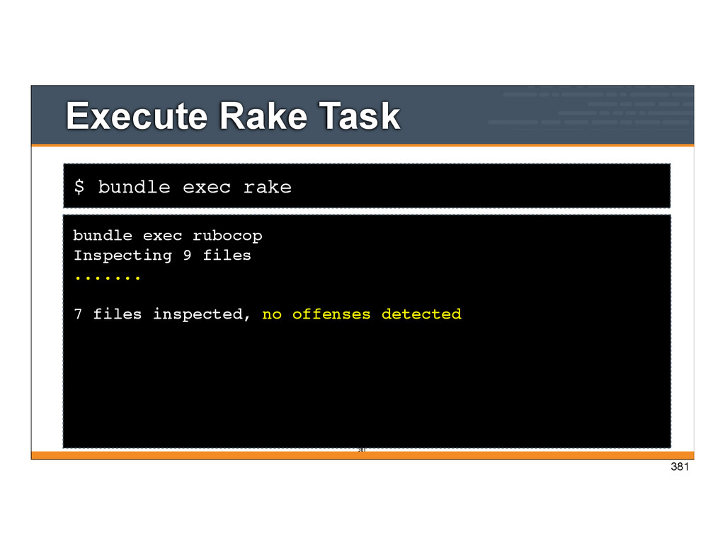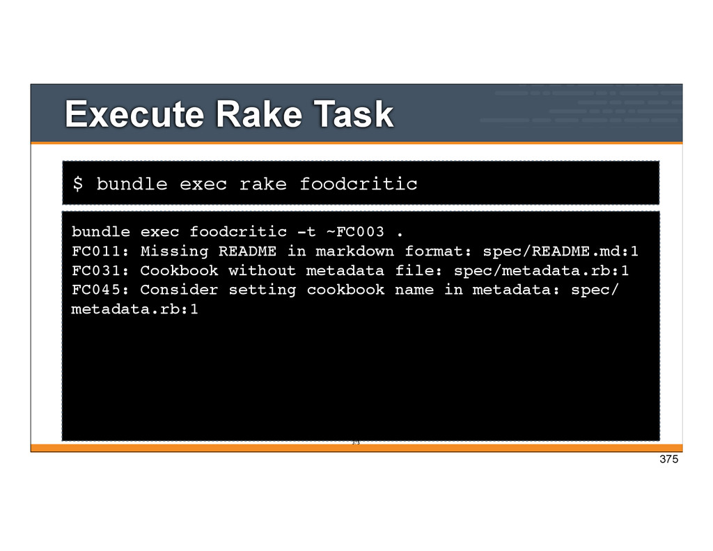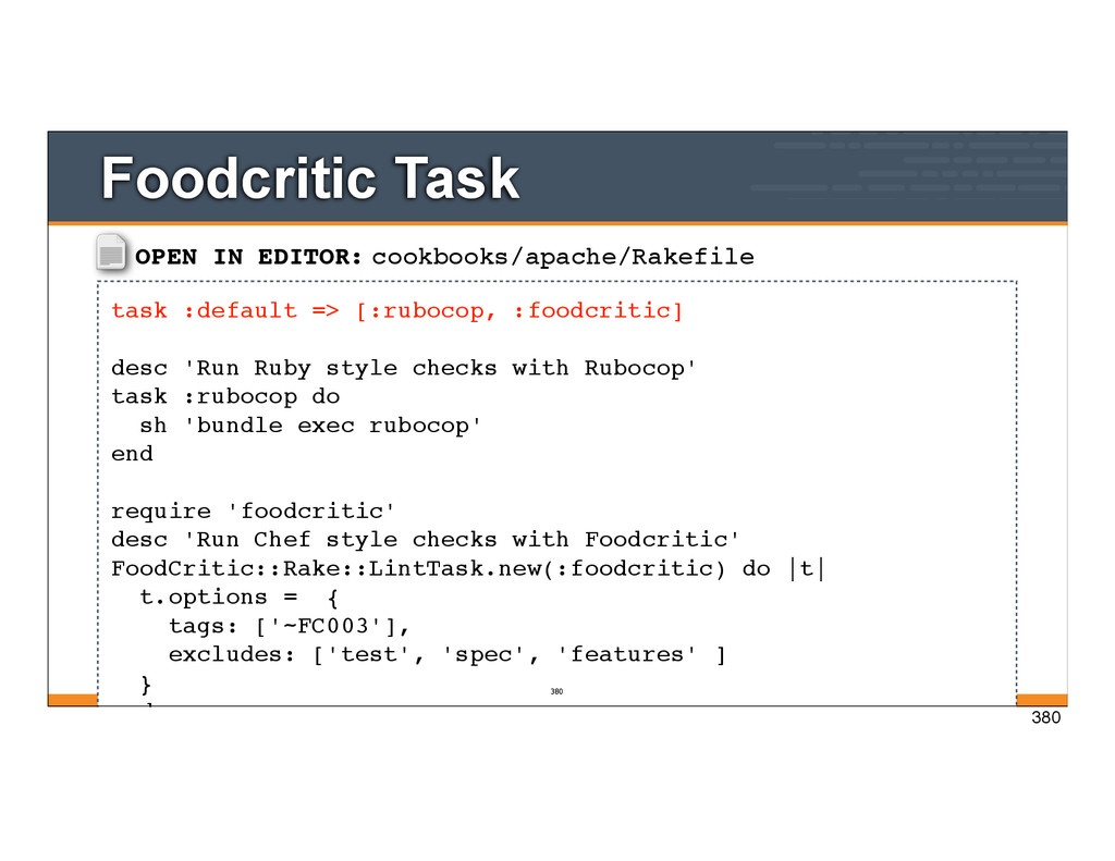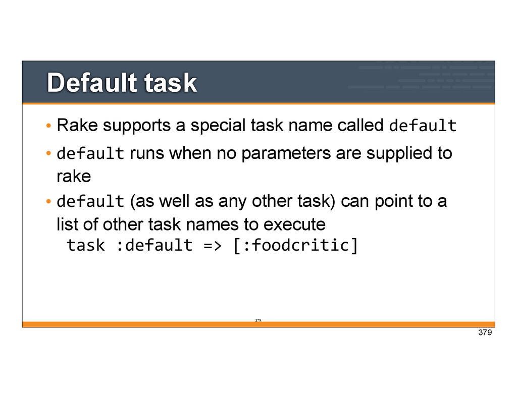 default • default runs when no parameters are supplied to rake • default (as well as any other task) can point to a list of other task names to execute task :default => [:foodcritic] 379 379
