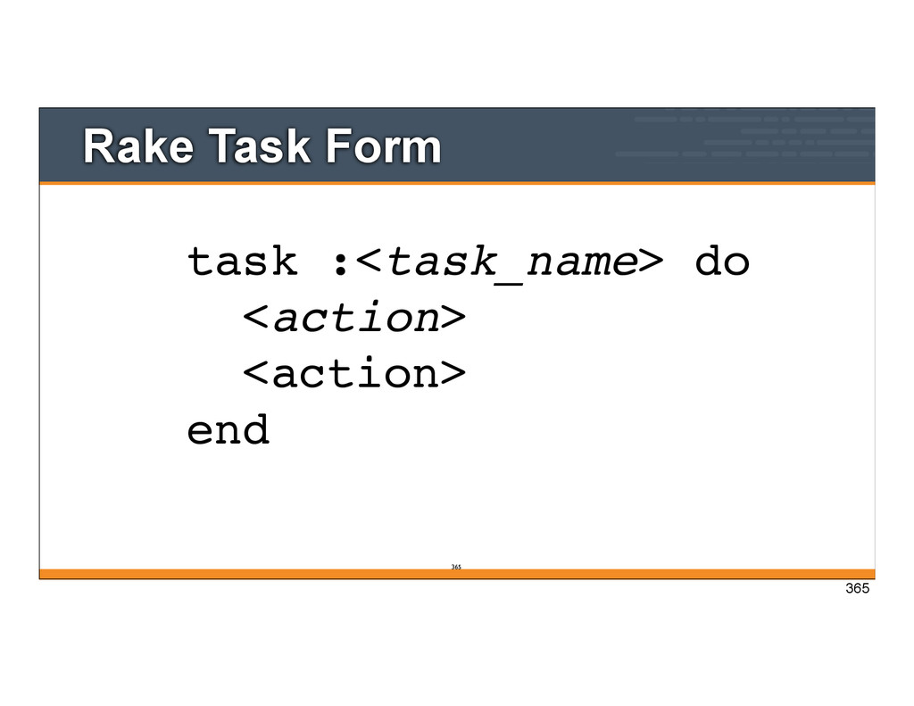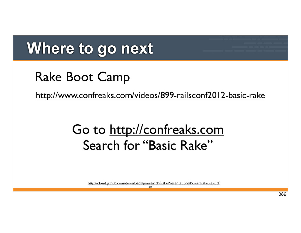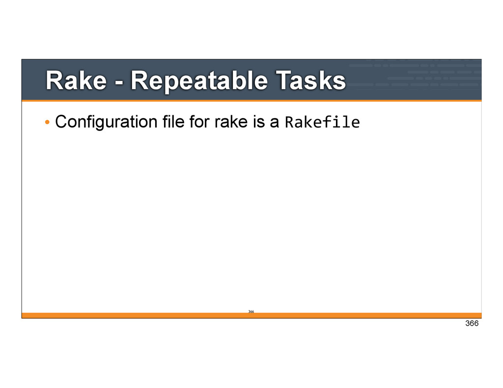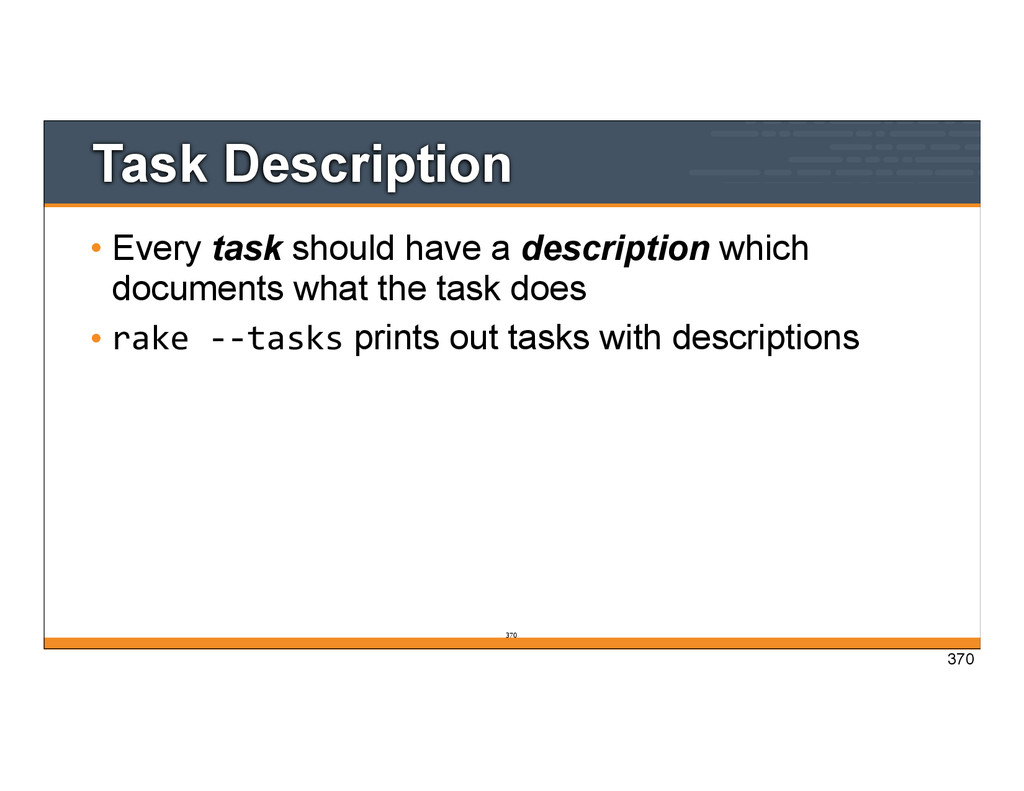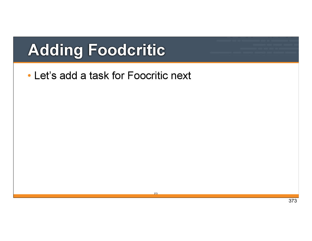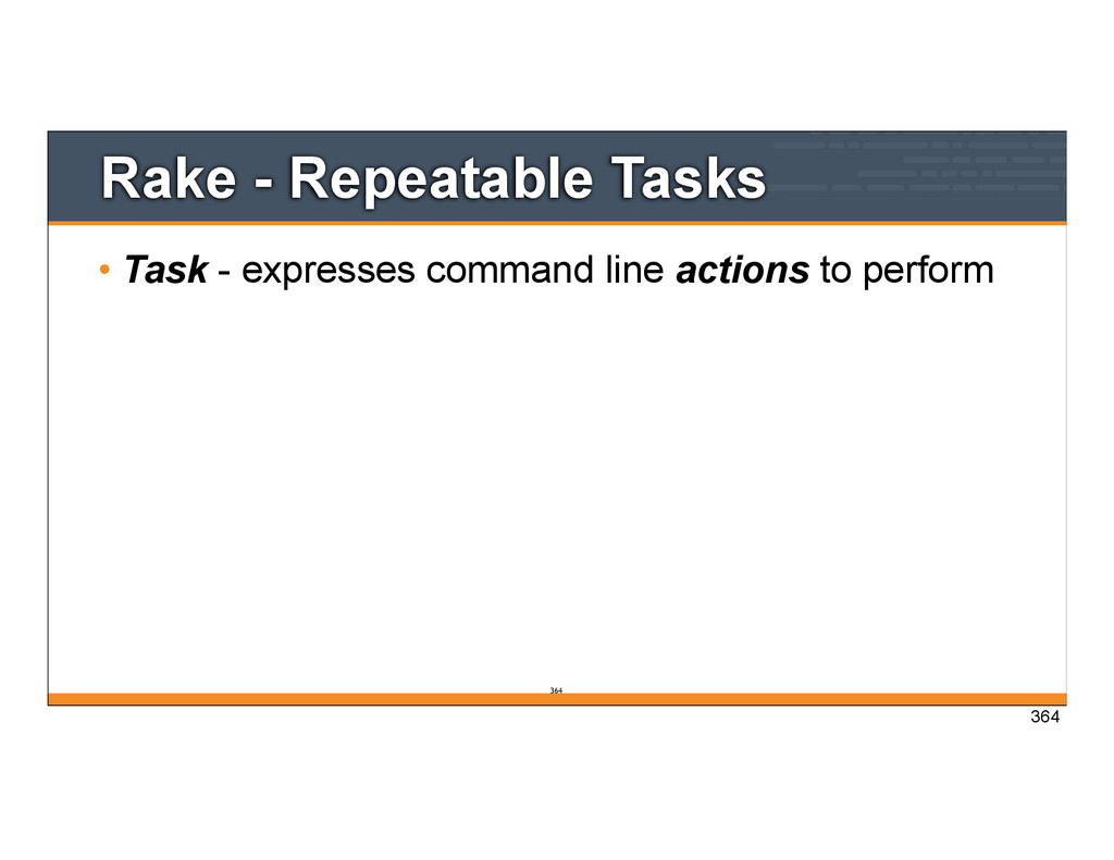default • default runs when no parameters are supplied to rake • default (as well as any other task) can point to a list of other task names to execute task :default => [:foodcritic] 379 379