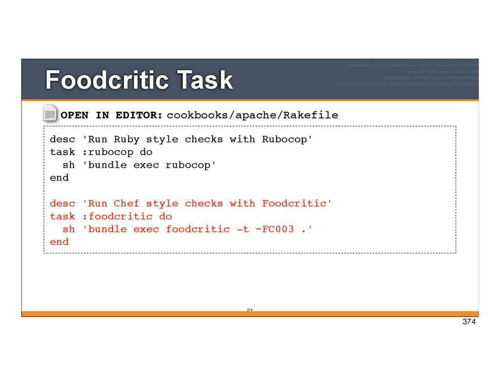 Rubocop' task :rubocop do sh 'bundle exec rubocop' end desc 'Run Chef style checks with Foodcritic' task :foodcritic do sh 'bundle exec foodcritic -t ~FC003 .' end Foodcritic Task 374 374