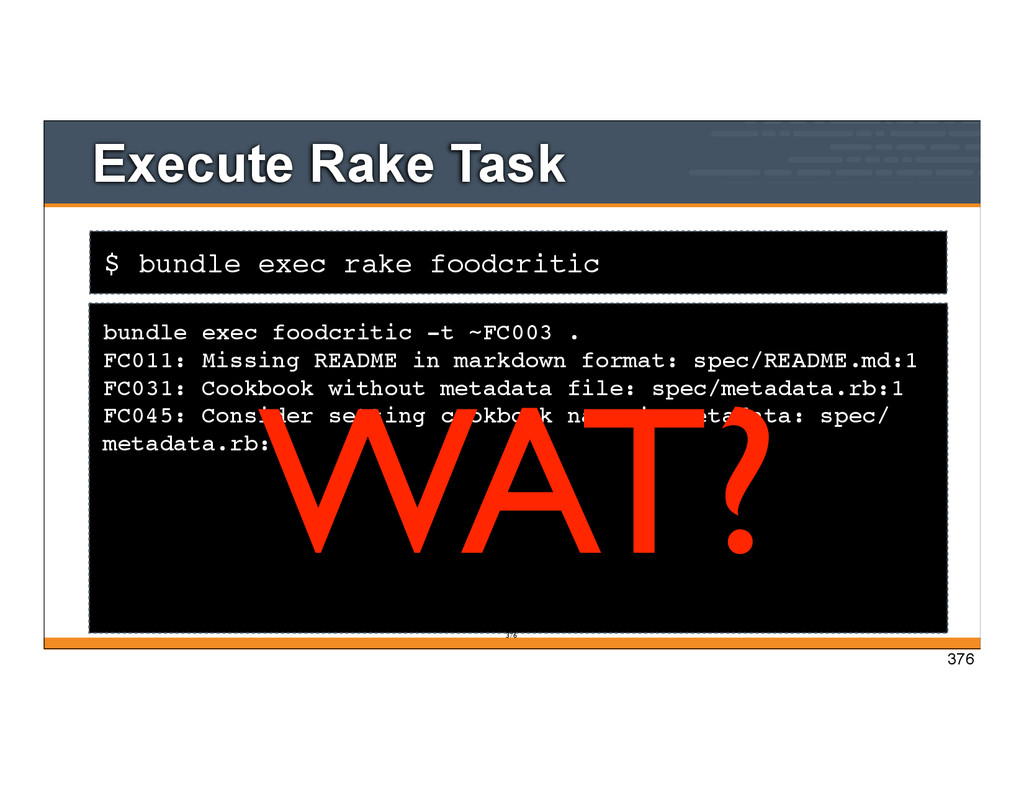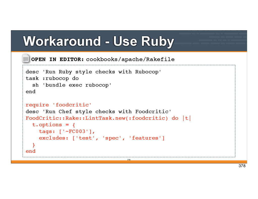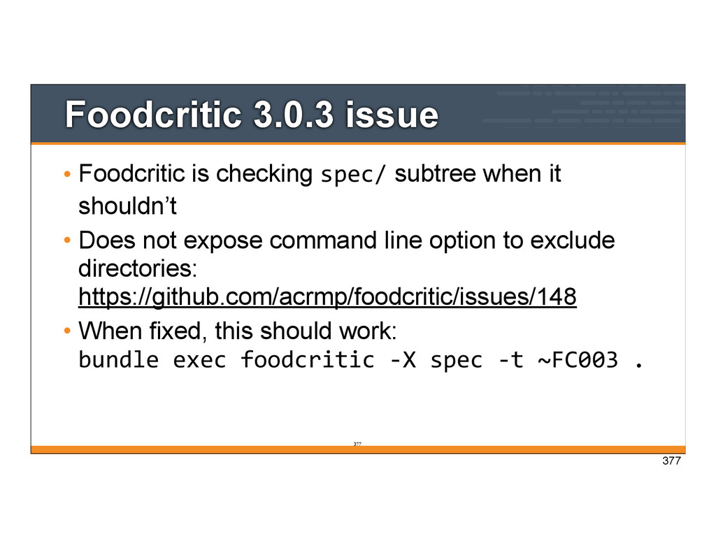 it shouldn’t • Does not expose command line option to exclude directories: https://github.com/acrmp/foodcritic/issues/148 • When fixed, this should work: bundle exec foodcritic -‐X spec -‐t ~FC003 . 377 377