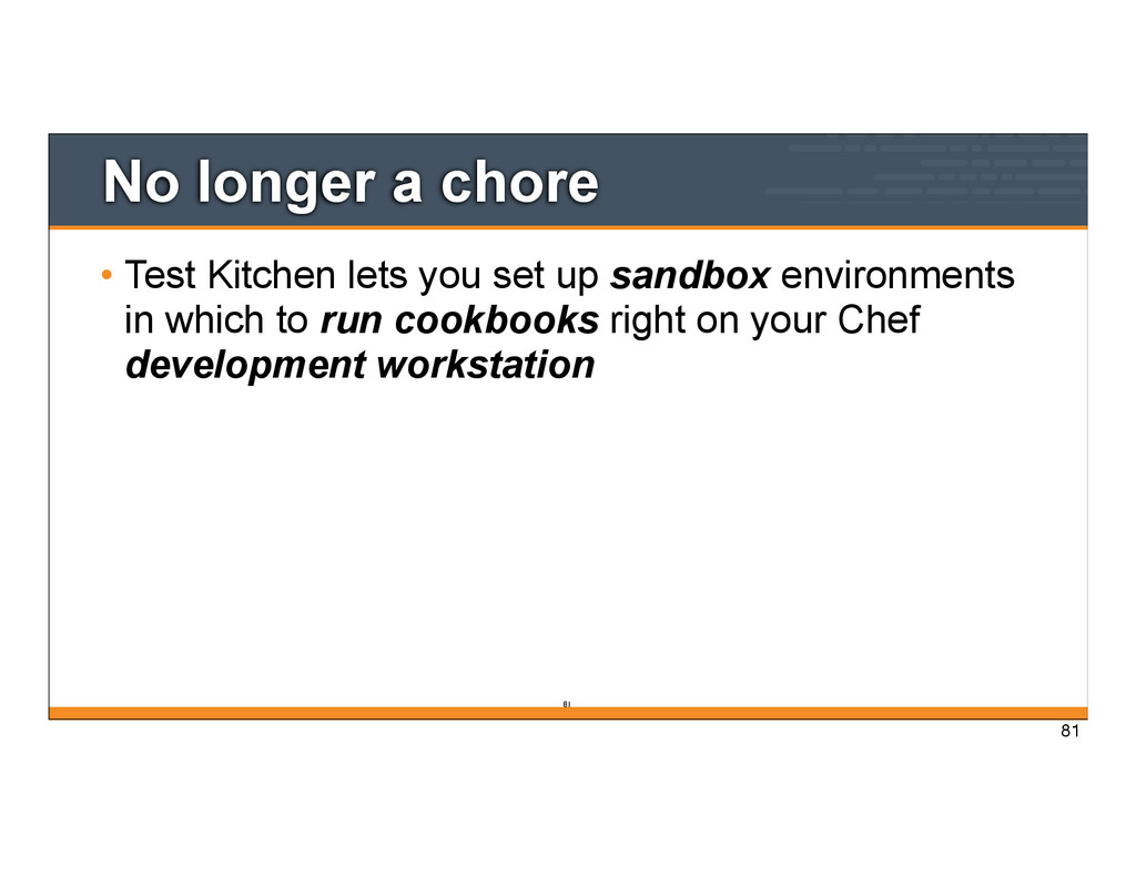 for managing sandbox environments and truly verifying that a cookbook produces the intended results • But it does require spinning up an instance and performing a full Chef converge, which can take a long time • Use Test Kitchen judiciously. The other tools can provide more limited forms of feedback faster. 223 223