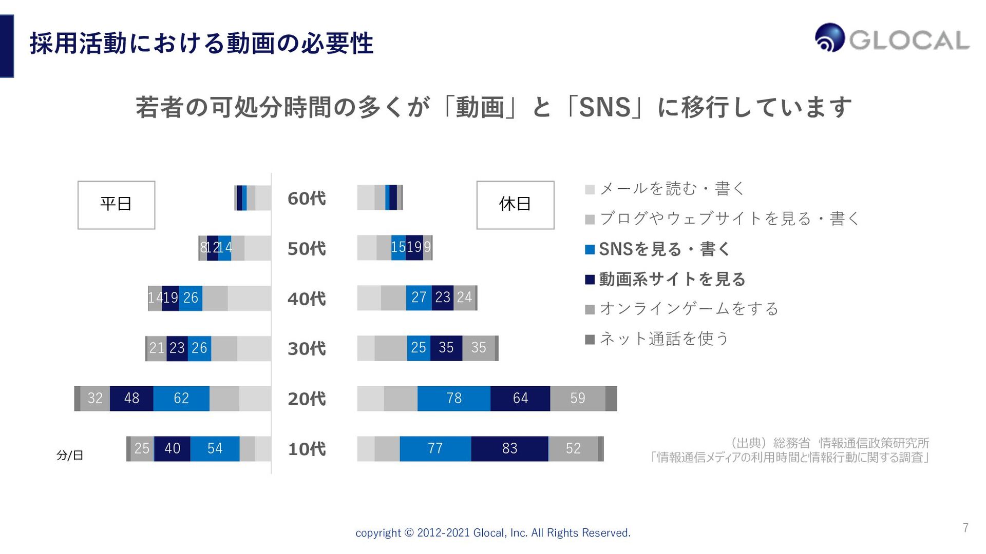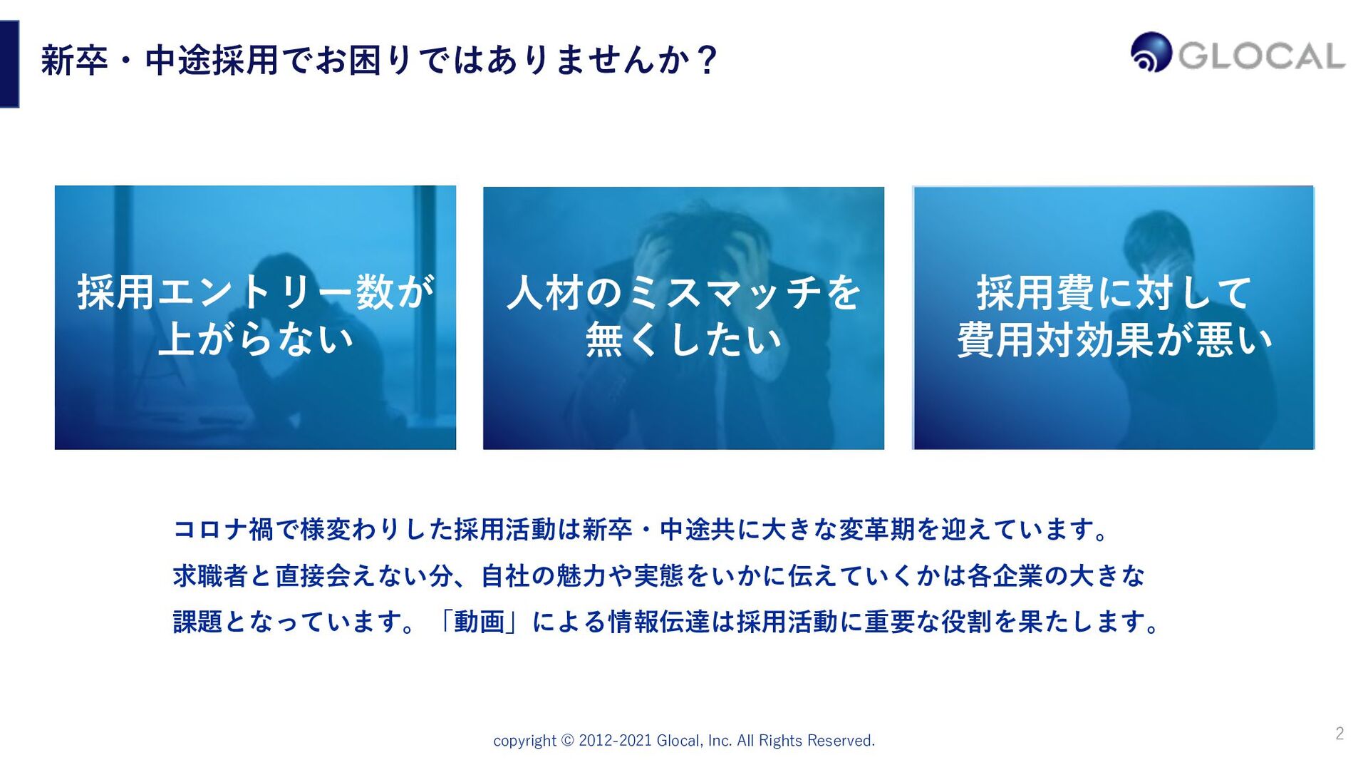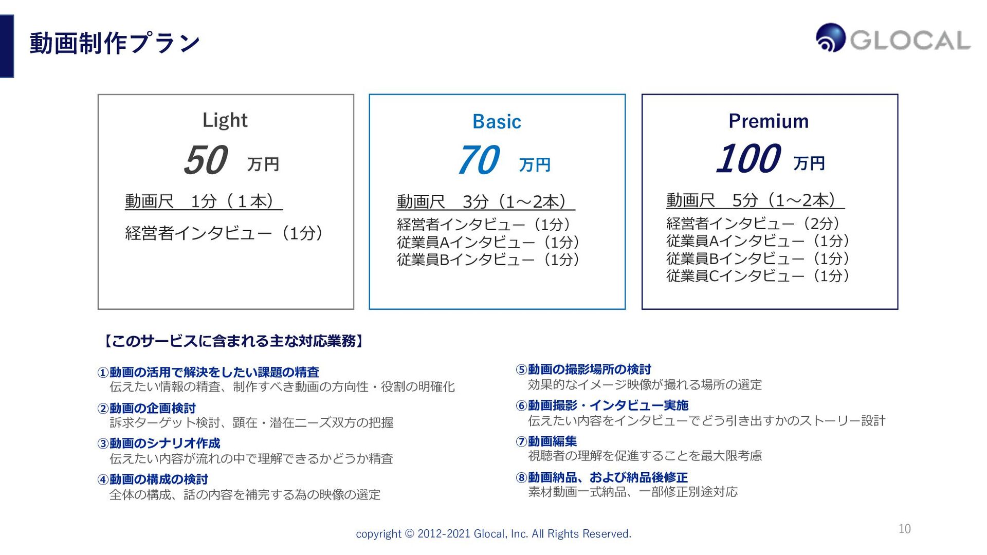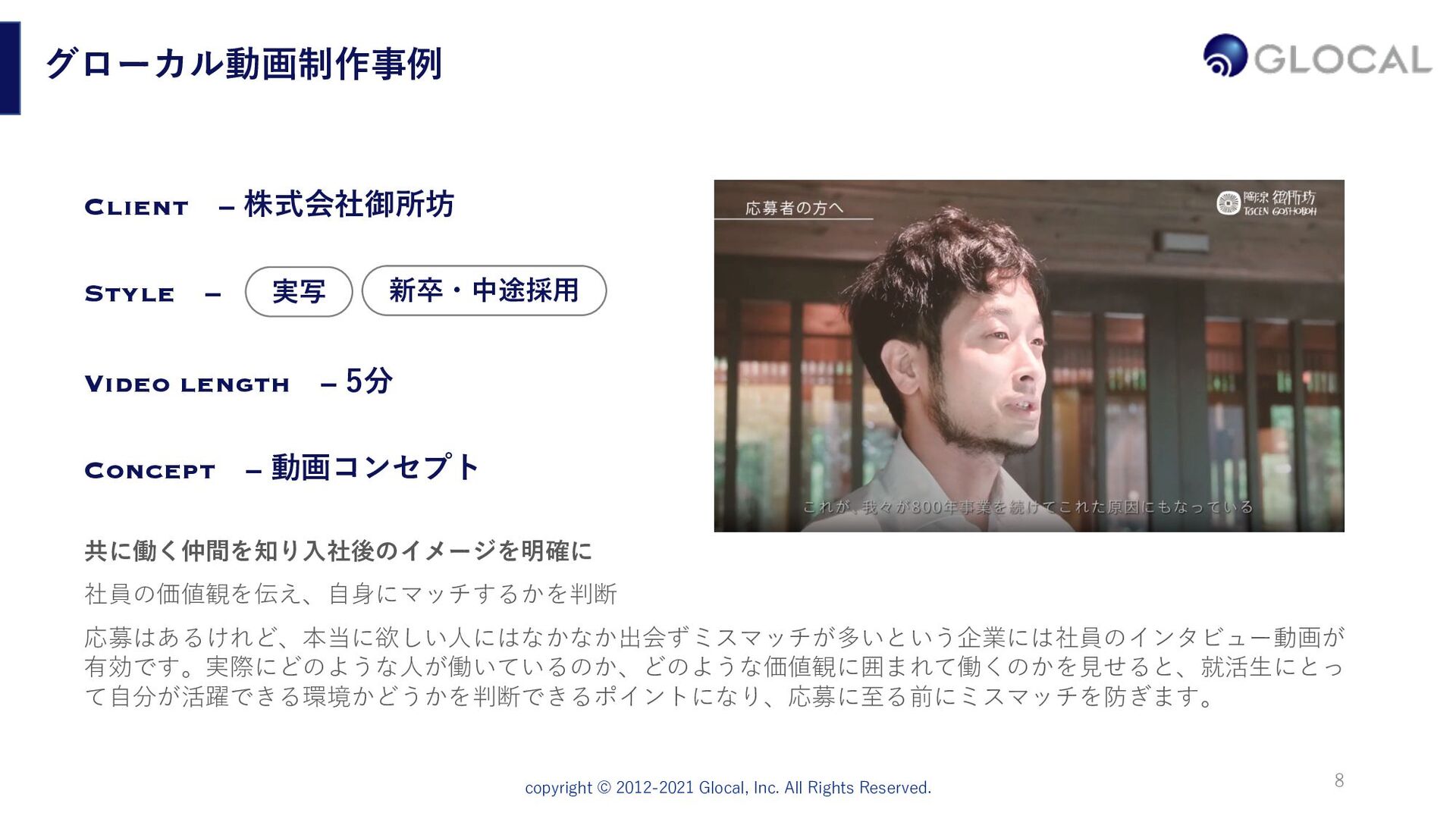 ⾃社サービスの紹介カタログのようにただ綺麗に⾒せるのではなく、貴社で働くことへ の必然性を提案するような⼝説き型の動画企画に重きを置いています。求職者が持つ疑 問や希望に共感し、それを提案となるような「ニーズ喚起型のシナリオ」を設計します。 10,000⼈以上の⾯接経験、採⽤・⼈事のプロによるインタビュー リクルート系経営コンサルティング会社、楽天、外資系⼈材会社で⻑年採⽤に携わり、 ⼤⼿からベンチャー企業まで1万⼈以上の⾯接をしてきたグローカル代表。その経験を ふまえたインタビューでリアルな現場の声を切り取り、説得⼒のある動画を制作します。 制作した動画を効果的に活⽤・発信していく⼿法の提案 動画制作して終わりではなく、きちんと採⽤プロセスに組み込んでいくことが⼤切です。 貴社に採⽤ホームページ、求職者向けのメール、会社説明会、各種SNS(YouTube、 Facebook、Twitter、note)などの活⽤⽅法も含めて、制作後の運⽤までサポートします。 9