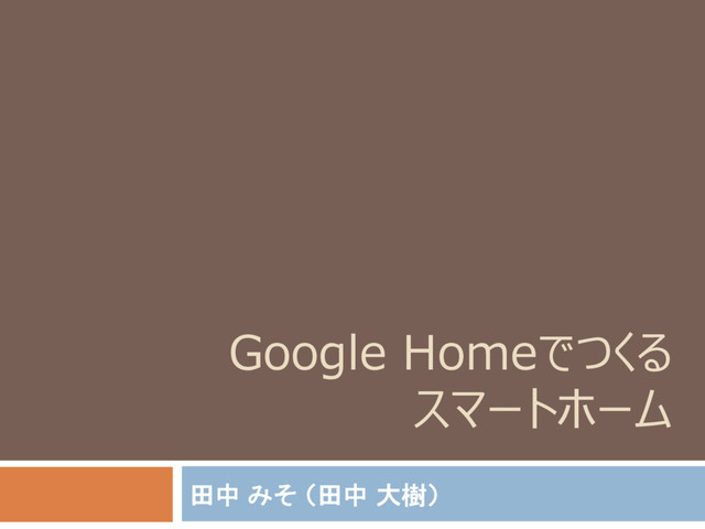 「スマートスピーカー勉強会 #3@ドワンゴ セミナールーム」にて行ったLT資料です。 Google Homeを使ったスマートホームの構成を簡単に説明します。