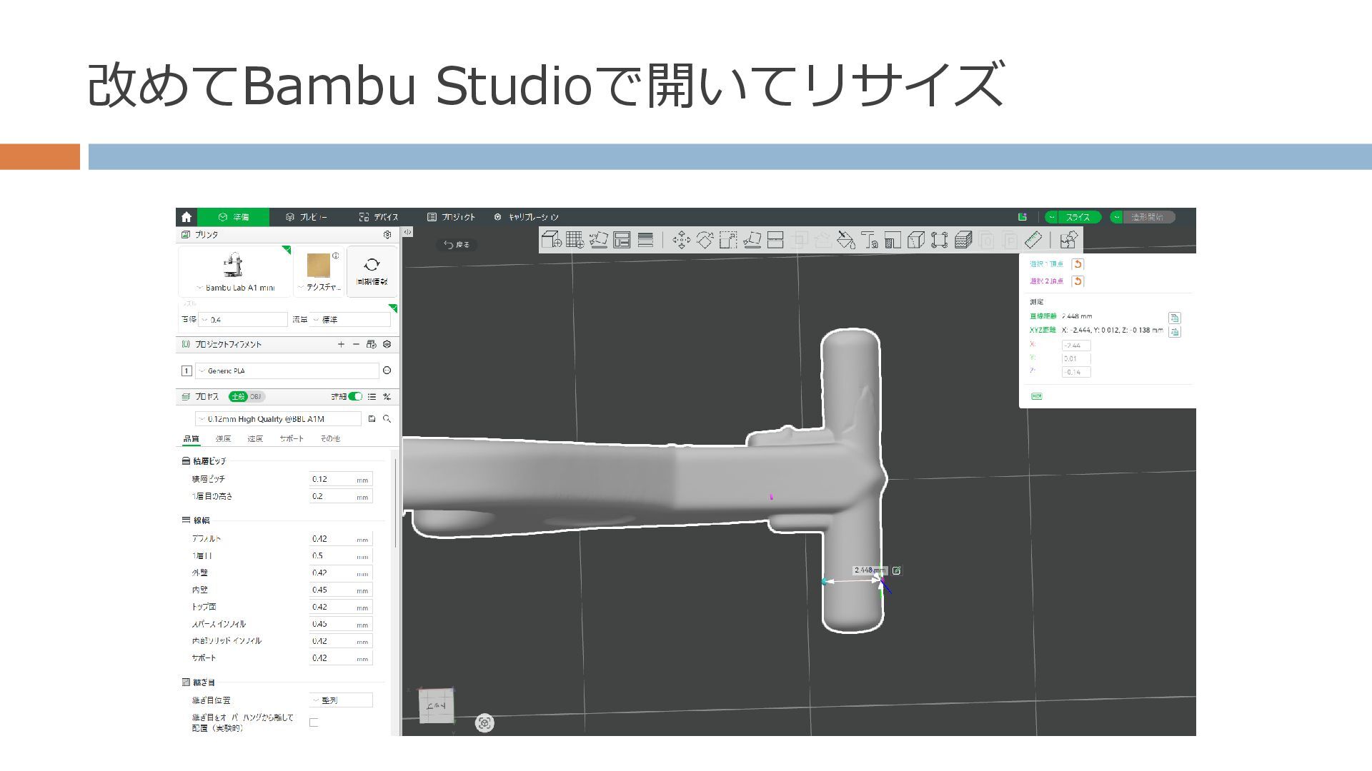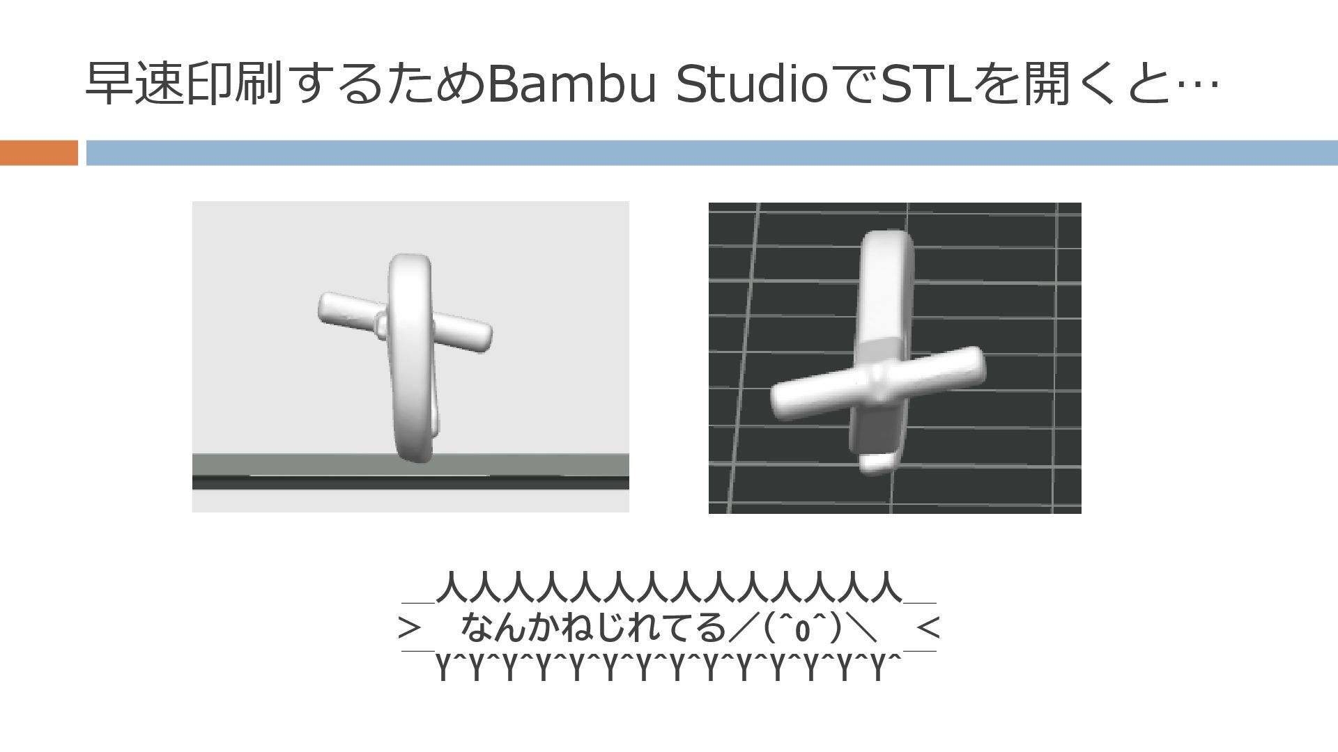 早速印刷するためBambu StudioでSTLを開くと… _人人人人人人人人人人人人人人_ > なんかねじれてる/(^o^)\ <  ̄Y^Y^Y^Y^Y^Y^Y^Y^Y^Y^Y^Y^Y^Y^ ̄
