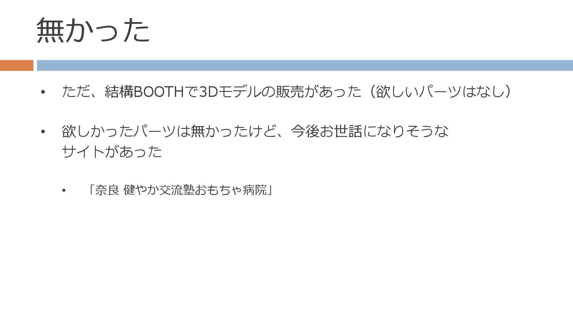 無かった • ただ、結構BOOTHで3Dモデルの販売があった(欲しいパーツはなし) • 欲しかったパーツは無かったけど、今後お世話になりそうな サイトがあった • 「奈良 健やか交流塾おもちゃ病院」