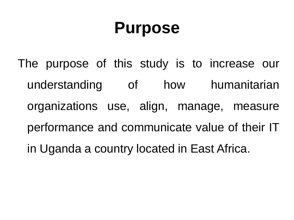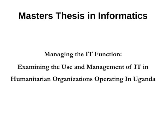 The purpose of this study is to provide insights into the management and use of IT in humanitarian organizations in Uganda. The online survey carried out with IT focal points working with these organizations found that other than a support function, Information Technology is used in different ways to include - staff security, peacekeeping, visibility and ICT4D among others. This research project has found that for various reasons (including funding) many humanitarian organizations struggle to establish good IT governance structures that would allow them fully benefit from Information Technology. However there are positive developments. Humanitarian organizations have in general taken significant steps to ensure that IT is a driving force that can support their overall mission. This opens opportunities for adoption of the known IT management and governance frameworks by more of these organizations.