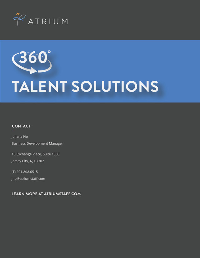 This is Atrium Staffing's 2017 Executive Summary. Atrium is a women owned certified firm focused on providing custom workforce solutions on a national level. We work with Fortune 500 companies designing intern programs, payrolling, staffing, MSP services and HR consulting. Our certification as a women owned business means that we can also help you increase your diversity spend.