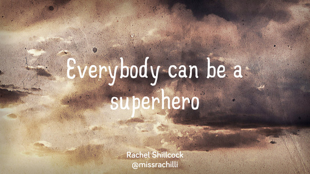 - Talk desc: Everybody is a superhero. We're all somebody that possesses "extraordinary or superhuman powers". It's analysing our strengths and weaknesses that becomes the fun part.