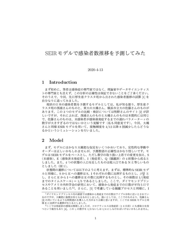 ߟ·Ͱʹ৮ස 70% Χοτͷ߹ 100 ܦͬͯ৽نױऀ 100 ਓͷϨϕ ϧʹΓ·ͤΜͰͨ͠ɻཧ༝ͷҰͭͱͯ͠ɺӜ͞ΜͷࢼࢉΑΓݱࡏͷঢ়گ ѱԽ͓ͯ͠Γɺࣗॗཁͷग़ͨ࣌Ͱͷ৽نײછऀ͕ 500 ਓ͔Β 700 ਓ ఔʹ૿͍͑ͯΔ͜ͱ͕͋Γ·͕͢ɺ্هͷಋग़ʹ͓͚ΔେࡶͳԾఆ͕ݪҼͰ ͋Δ͔͠Ε·ͤΜɻͱ͍͑ɺϞσϧͷఆੑతͳ;Δ·͍ະัଊऀΛߟྀʹ ೖΕͯมΘΒͣɺ৮සΛ 8 ׂݮগͤ͞Δ͜ͱʹΑͬͯऩଋՄೳͩͱ͍͏ ݁ՌͱͳΓ·ͨ͠ɻ Figure 2: ྦྷੵײછऀ Figure 3: ҰͨΓͷ৽نݕࠪཅੑ References [1] ຊܦࡁ৽ฉ 4/11 ʮ৮ 7 ׂݮʯͰऩଋ·ͰظԽɹେڭत͕ܯ https://www.nikkei.com/article/DGXMZO57961860R10C20A4CZ8000/ [2] http://jun-makino.sakuraweb.com/articles/corona/face.html [3] COVID-19 ใڞ༗ ʕ COVID19-Information sharing, ಓݝ͝ͱͷγ ϛϡϨʔγϣϯʹΑΔݕ౼, [4] Wei, Wycliffe E. ”Presymptomatic Transmission of SARS-CoV-2ʕ Singapore, January 23–March 16, 2020.” MMWR. Morbidity and Mortality Weekly Report 69 (2020). [5] Sato, Aki-Hiro, et al. ”An epidemic simulation with a delayed stochastic SIR model based on international socioeconomic-technological databases.” 2015 IEEE International Conference on Big Data (Big Data). IEEE, 2015. [6] ް ੜ ࿑ ಇ ল, ৽ ܕ ί ϩ φ Π ϧ ε ײ છ ʹ ͭ ͍ ͯ, https://www.mhlw.go.jp/stf/seisakunitsuite/bunya/0000164708 00001.html https://www.fttsus.jp/covinfo/pref-simulation/ 3