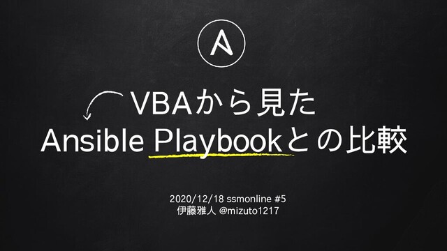 = "テスト" MsgBox str_hoge Dim i As = 11 i = i + 10 End Sub インデントはなくても動く TABも使える 全体的な構文の比較 Ansible Playbook ✘ 記載内容が定まったセクションあり --- - hosts: all vars: filename: test tasks: - name: touch file file: path: /etc/{{ filename }} state: touch インデントは必要(半角SP2個が基準) TABは使えない 4