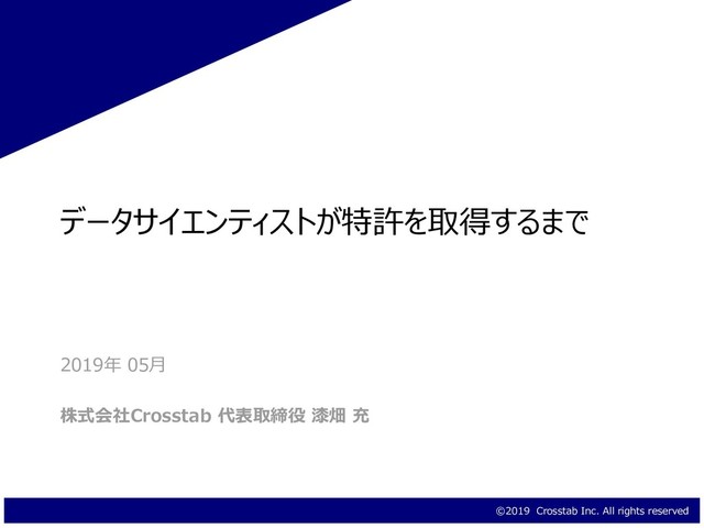 めちゃくちゃわかりやすい https://www.ryupat.com/patentmerit/ *1 アカデミックでの業績は論文ですが、ビジネスの研究開発は特許が重視されます *2 特許は出願すると1年半後に公開されます 発明の実施を他社が見た時に簡単に模倣できる ものは特許を取得したほうが良い。一方で発明を 見ても到底マネできないものは特許不要 データサイエンティストの発明は前者である メリット デメリット • 独占排他的に実施できる • 無形固定資産として属人的な技術を会 社のものにできる(論文はなりません *1) • 他社へのライセンシングでの利益が見込め る • 自社製品のアピール • 発明内容が公開される(*2) • 維持費にお金がかかる • 発明者として特許明細に名前が残る • 履歴書やlinkedinなどへ記載ができる • インセンティブ報酬を受け取れる (主に名誉です) • 取得のために弁理士の先生との打ち合わせ がある 気の利いたものができたらぜひ権利化にトライし よう 企業 発明家