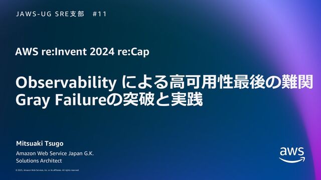 JAWS-UG SRE支部 #11 での資料です。 AWS re:Invent 2024でのStripe社のセッションから高い可用性に向けた取り組みやグレー障害への対応をご紹介し、CloudWatchを活用した観測の取り組みをご紹介しています。