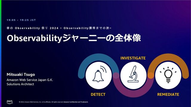 rights reserved. Amazon Confidential and Trademark. 春 の O b s e r v a b i l i t y 祭 り 2 0 2 4 ~ O b s e r v a b i l i t y 獲 得 ま で の 旅 ~ Observabilityジャーニーの全体像 Mitsuaki Tsugo 1 9 : 0 5 - 1 9 : 2 5 J S T Amazon Web Service Japan G.K. Solutions Architect DETECT INVESTIGATE REMEDIATE