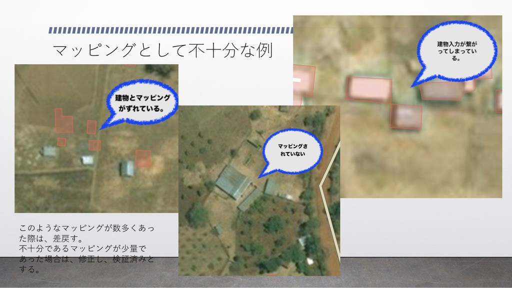 マッピングとして不⼗分な例 このようなマッピングが数多くあっ た際は、差戻す。 不⼗分であるマッピングが少量で あった場合は、修正し、検証済みと する。