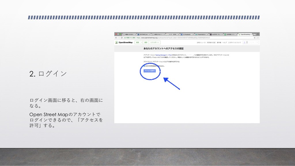 2. ログイン ログイン画⾯に移ると、右の画⾯に なる。 Open Street Mapのアカウントで ログインできるので、「アクセスを 許可」する。