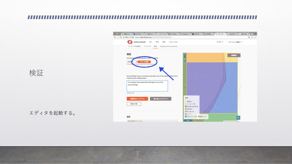 検証 地図上の⻩⾊で塗られたメッシュを選 択し、検証を開始する。 検証済みであるメッシュは緑⾊担って いる。