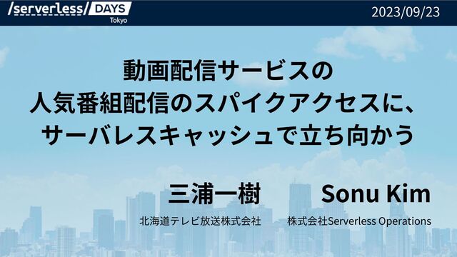 動画配信サービスの 人気番組配信のスパイクアクセスに、 サーバレスキャッシュで立ち向かう 三浦一樹 北海道テレビ放送株式会社 Sonu Kim 株式会社Serverless Operations 2023/09/23