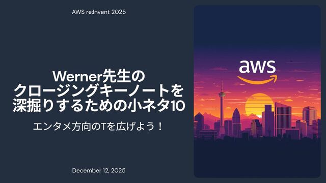 AWS re:Invent 2025 で行われた Dr. Werner Vogels の最後のクロージングキーノートを、エンタメ視点で深掘りするライトニングトーク資料です。