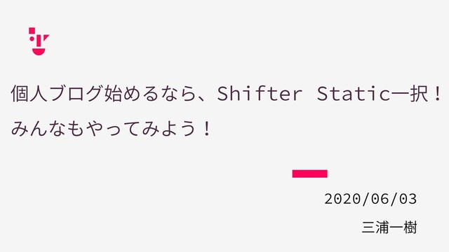 個⼈ブログ始めるなら、Shifter Static⼀択! みんなもやってみよう! 2020/06/03 三浦⼀樹