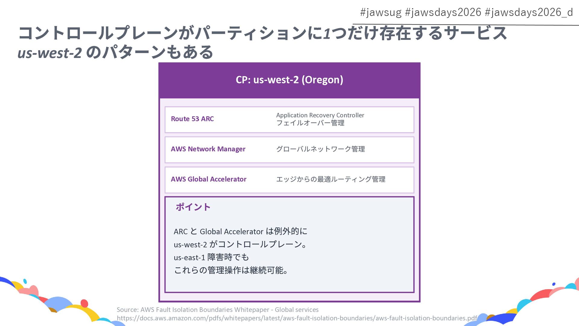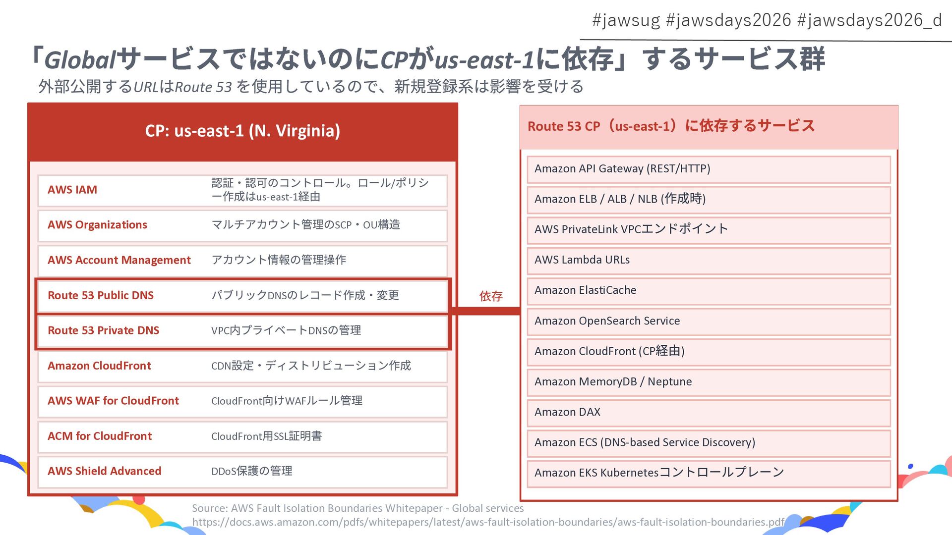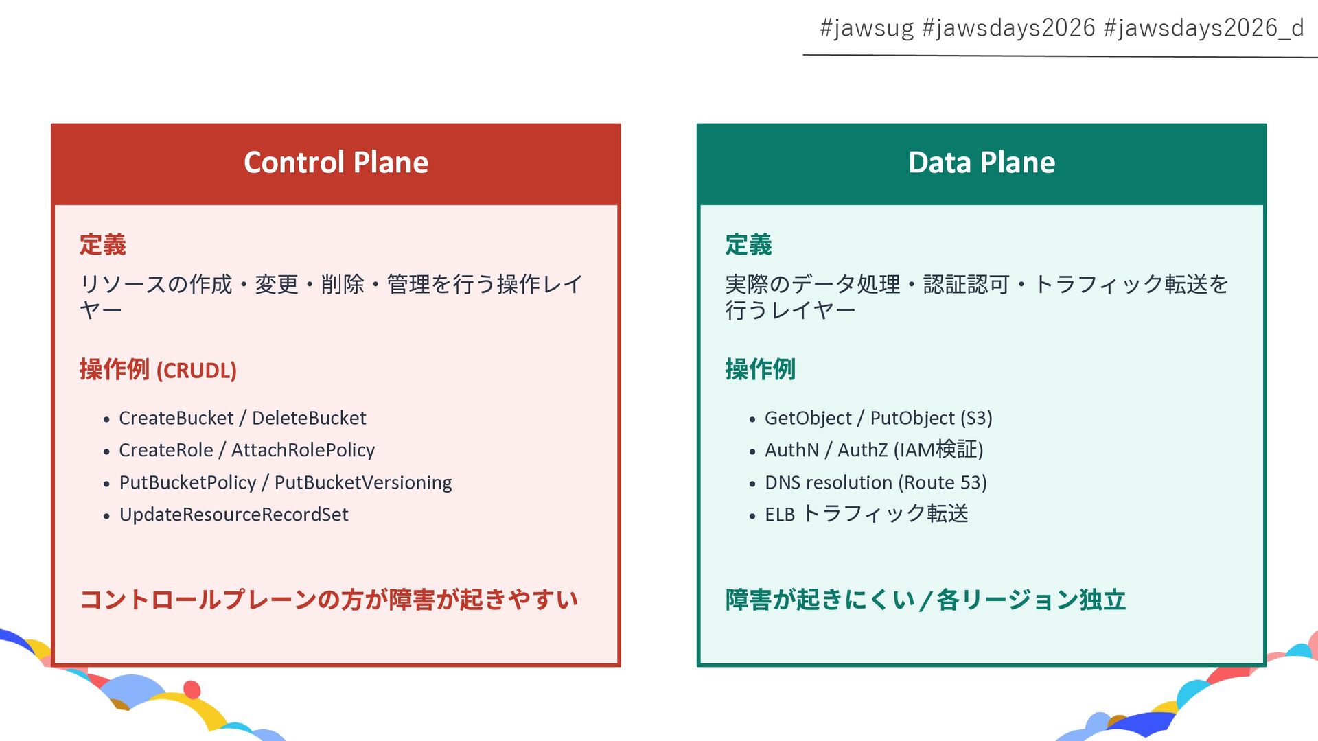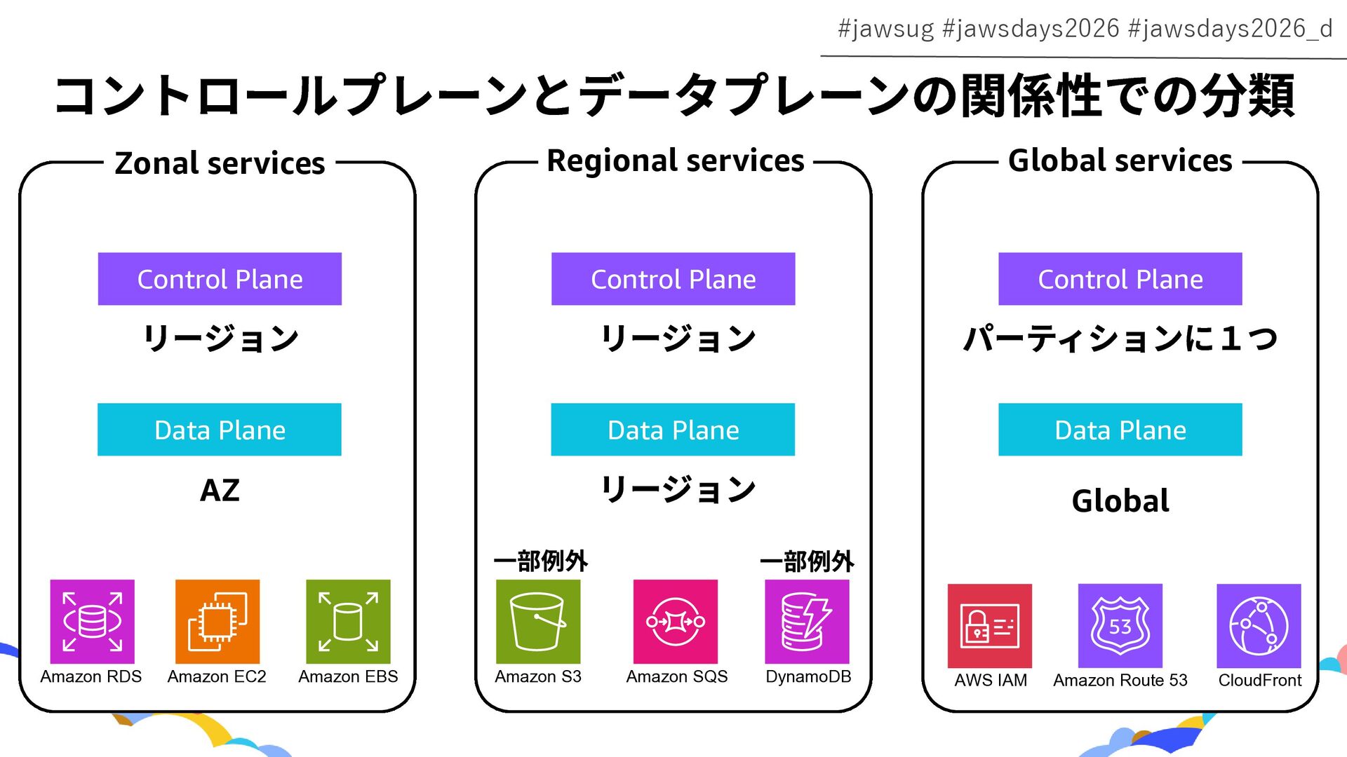 RDS Amazon EC2 Amazon EBS Amazon S3 Amazon SQS DynamoDB Amazon Route 53 AWS IAM CloudFront Control Plane Data Plane Control Plane Data Plane Control Plane Data Plane リージョン AZ リージョン リージョン パーティションに1つ Global コントロールプレーンとデータプレーンの関係性での分類 一部例外 一部例外