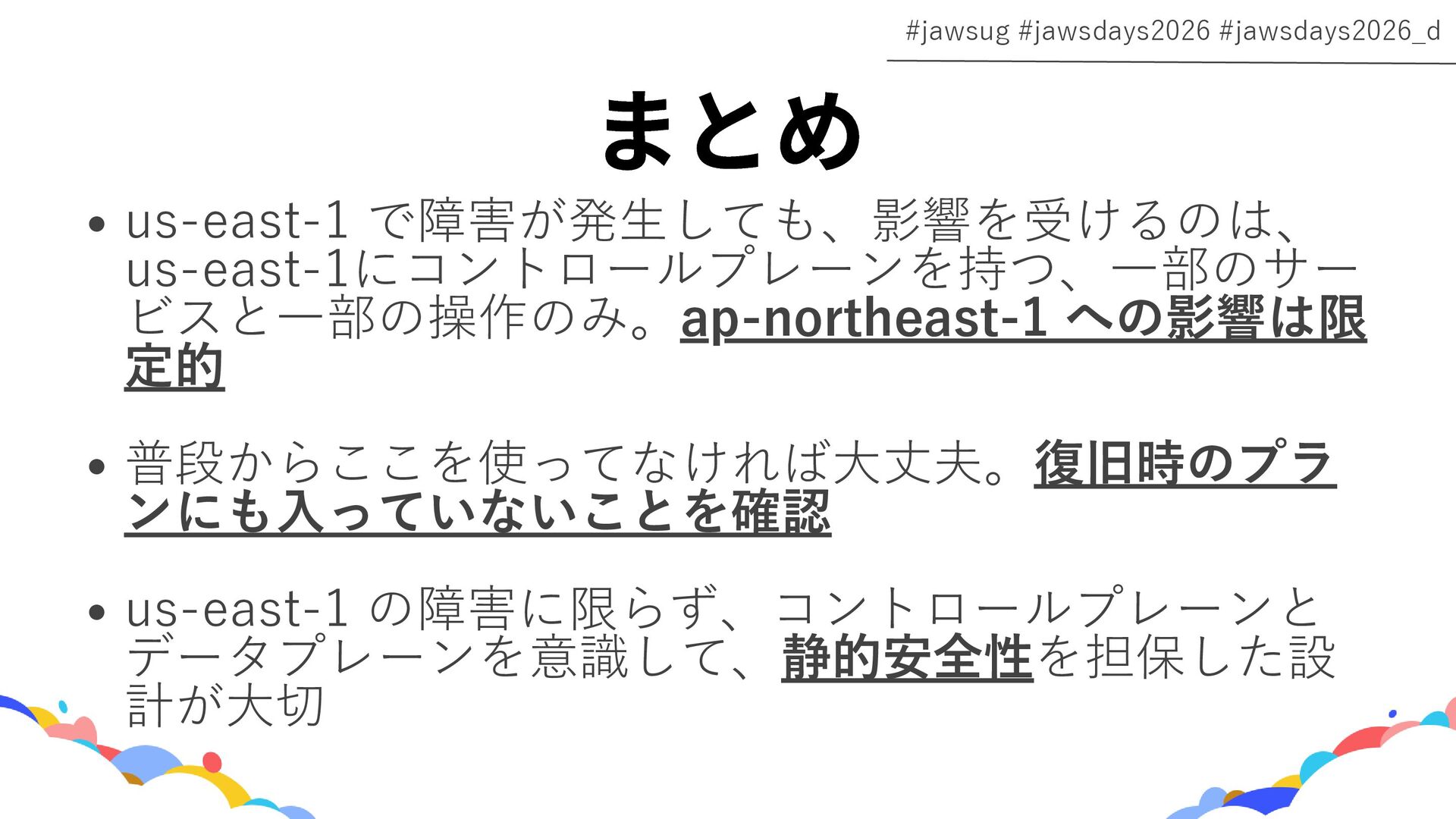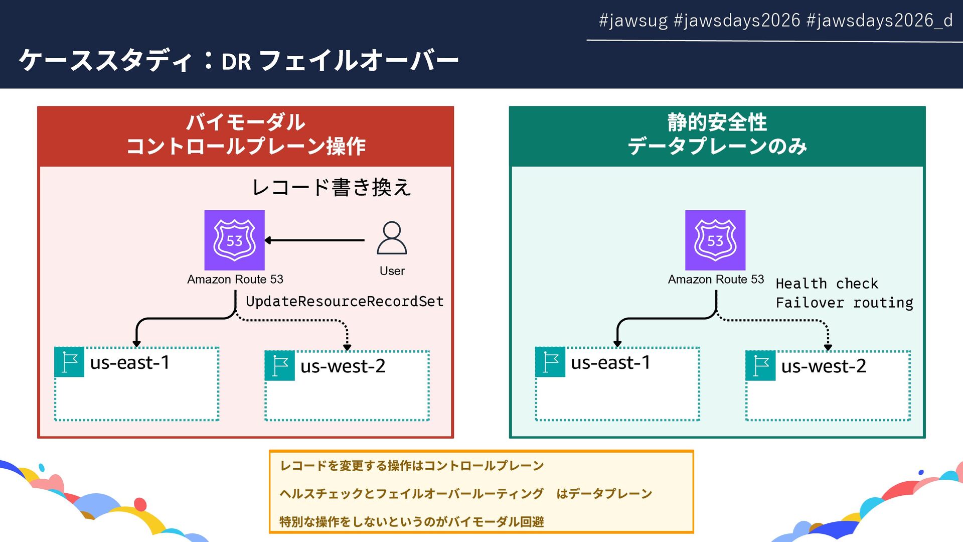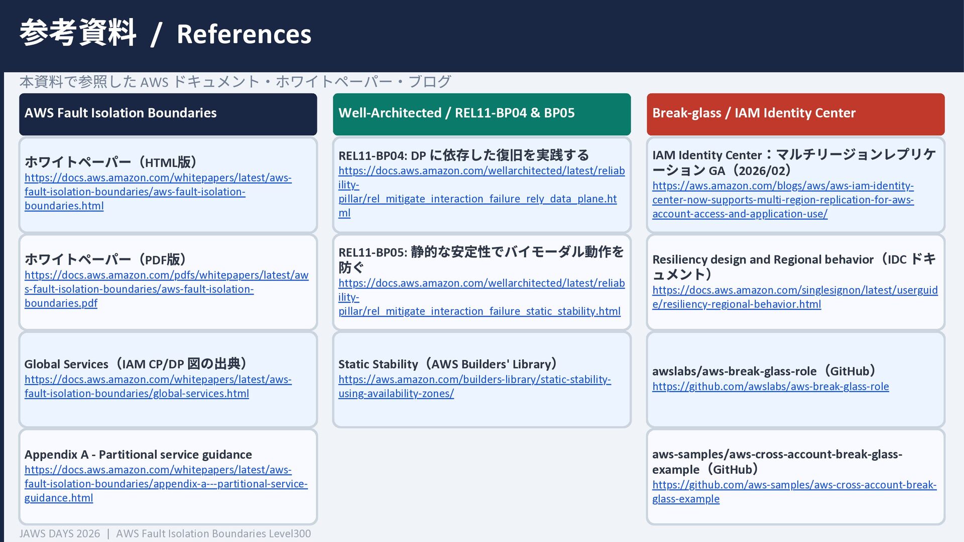 RDS Amazon EC2 Amazon EBS Amazon S3 Amazon SQS DynamoDB Amazon Route 53 AWS IAM CloudFront Control Plane Data Plane Control Plane Data Plane Control Plane Data Plane リージョン AZ リージョン リージョン パーティションに1つ Global コントロールプレーンとデータプレーンの関係性での分類 一部例外 一部例外