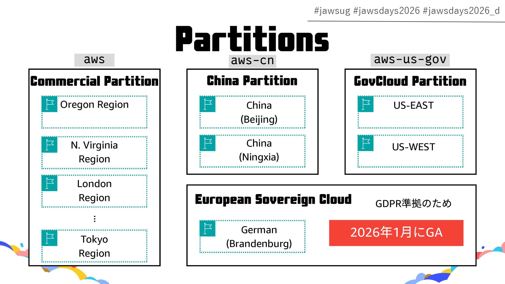 Region China (Beijing) China (Ningxia) US-EAST US-WEST Commercial Partition China Partition GovCloud Partition London Region ... aws aws-cn aws-us-gov European Sovereign Cloud German (Brandenburg) 2026 年1 ⽉にGA GDPR 準拠のため