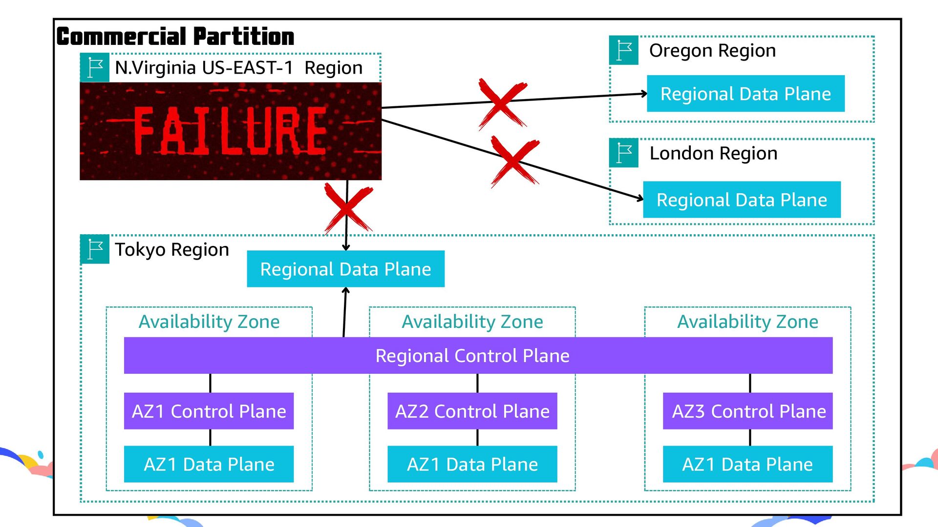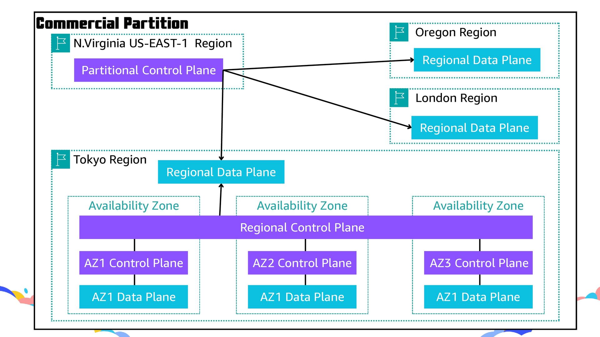 Zone Availability Zone Regional Control Plane AZ1 Control Plane AZ2 Control Plane AZ3 Control Plane AZ1 Data Plane AZ1 Data Plane AZ1 Data Plane N.Virginia US-EAST-1 Region Partitional Control Plane Oregon Region London Region Regional Data Plane Regional Data Plane