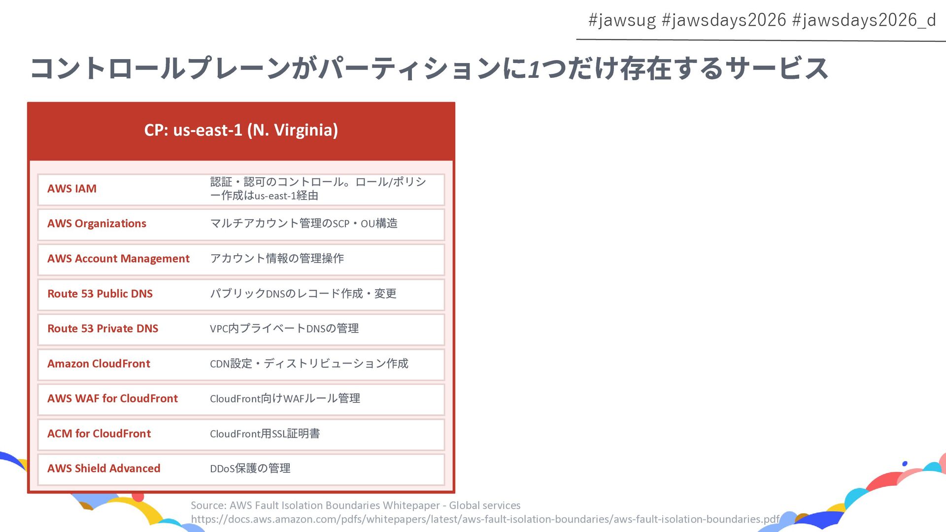 10. #jawsug #jawsdays2026 #jawsdays2026_d コントロールプレーンがパーティションに1 つだけ存在するサービス CP: us-east-1 (N. Virginia) AWS