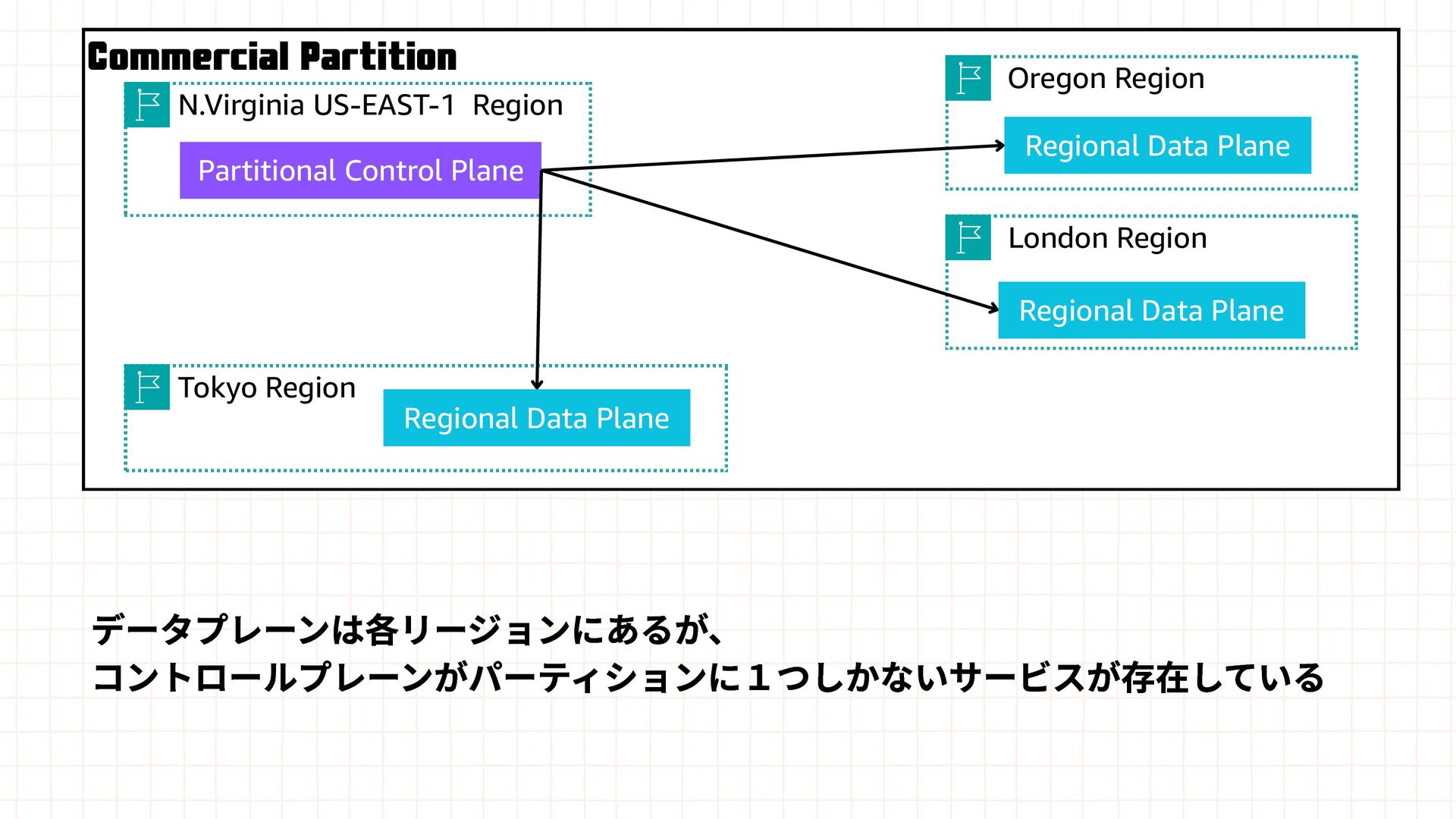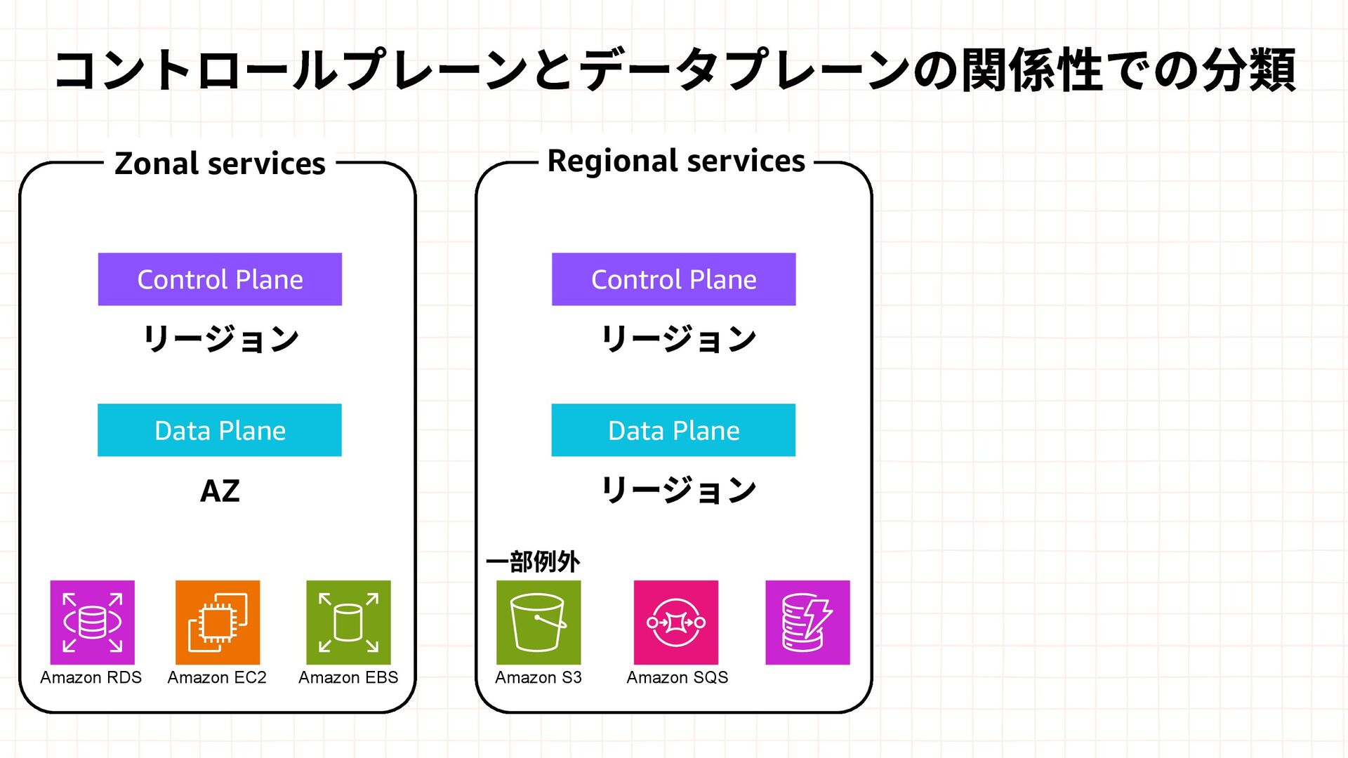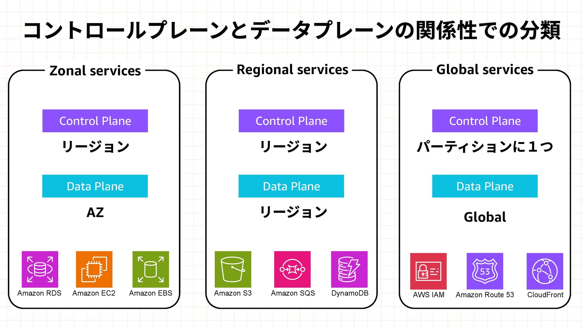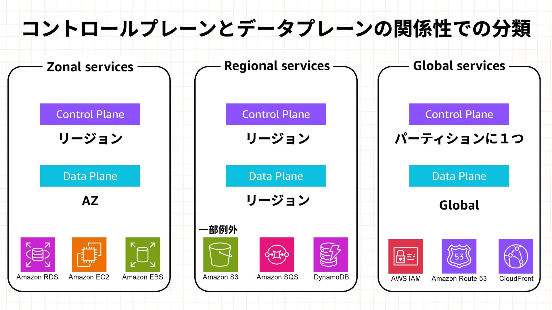 Amazon EBS Amazon S3 Amazon SQS DynamoDB Amazon Route 53 AWS IAM CloudFront Control Plane Data Plane Control Plane Data Plane Control Plane Data Plane リージョン AZ リージョン リージョン パーティションに1つ Global コントロールプレーンとデータプレーンの関係性での分類