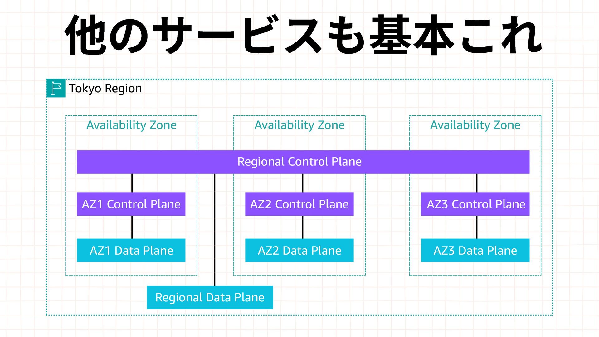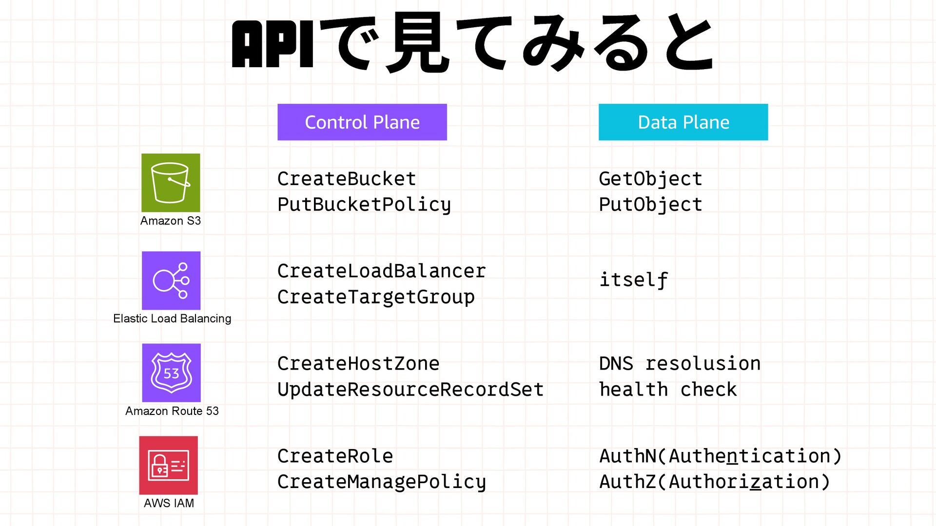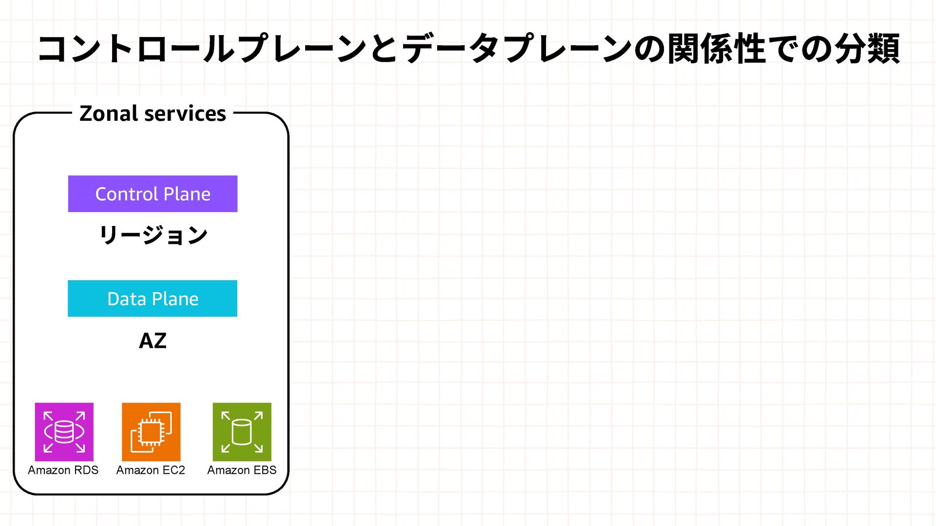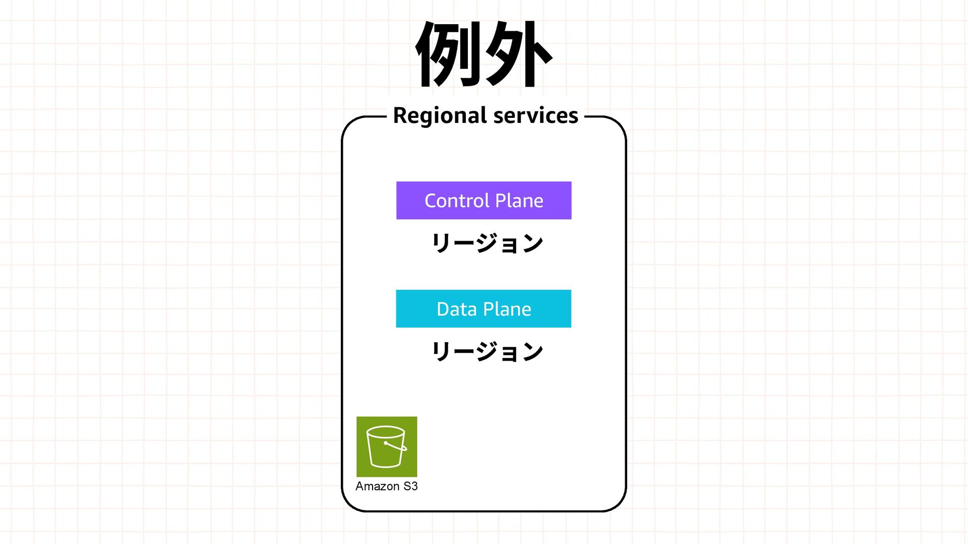 Amazon EBS Amazon S3 Amazon SQS DynamoDB Amazon Route 53 AWS IAM CloudFront Control Plane Data Plane Control Plane Data Plane Control Plane Data Plane リージョン AZ リージョン リージョン パーティションに1つ Global コントロールプレーンとデータプレーンの関係性での分類
