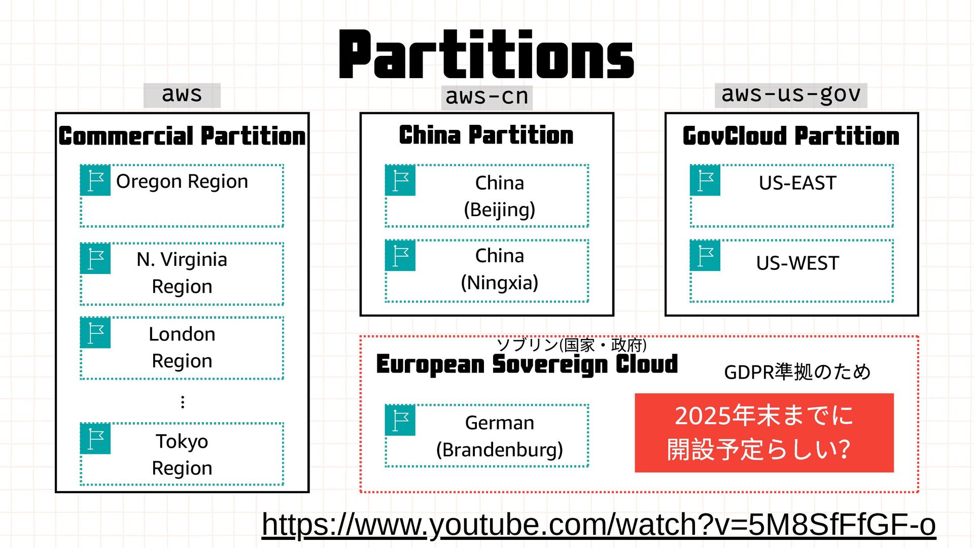 China (Ningxia) US-EAST US-WEST Commercial Partition China Partition GovCloud Partition London Region ... European Sovereign Cloud German (Brandenburg) 2025 年末までに 開設予定らしい? GDPR 準拠のため https://www.youtube.com/watch?v=5M8SfFfGF-o aws aws-cn aws-us-gov ソブリン( 国家・政府)