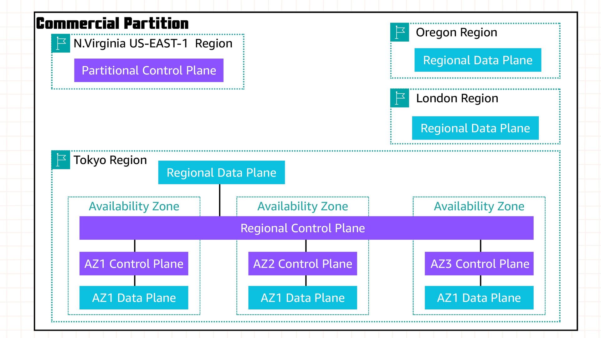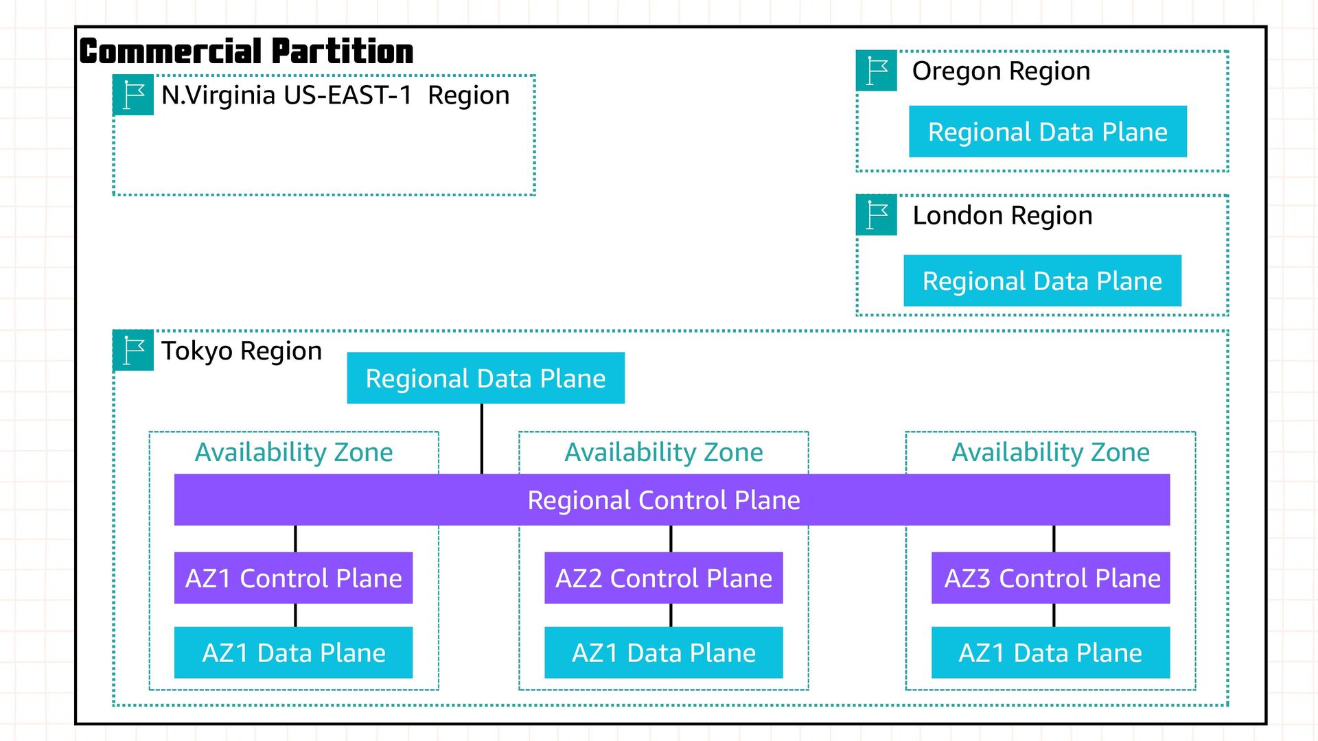 Zone Availability Zone Regional Control Plane AZ1 Control Plane AZ2 Control Plane AZ3 Control Plane AZ1 Data Plane AZ1 Data Plane AZ1 Data Plane N.Virginia US-EAST-1 Region Oregon Region London Region Regional Data Plane Regional Data Plane Partitional Control Plane
