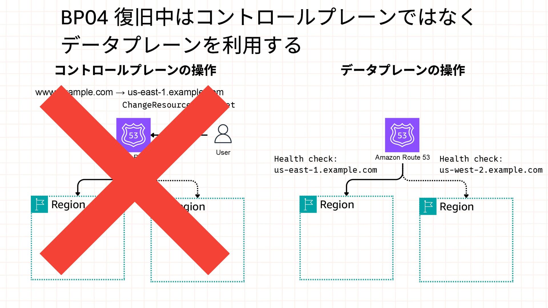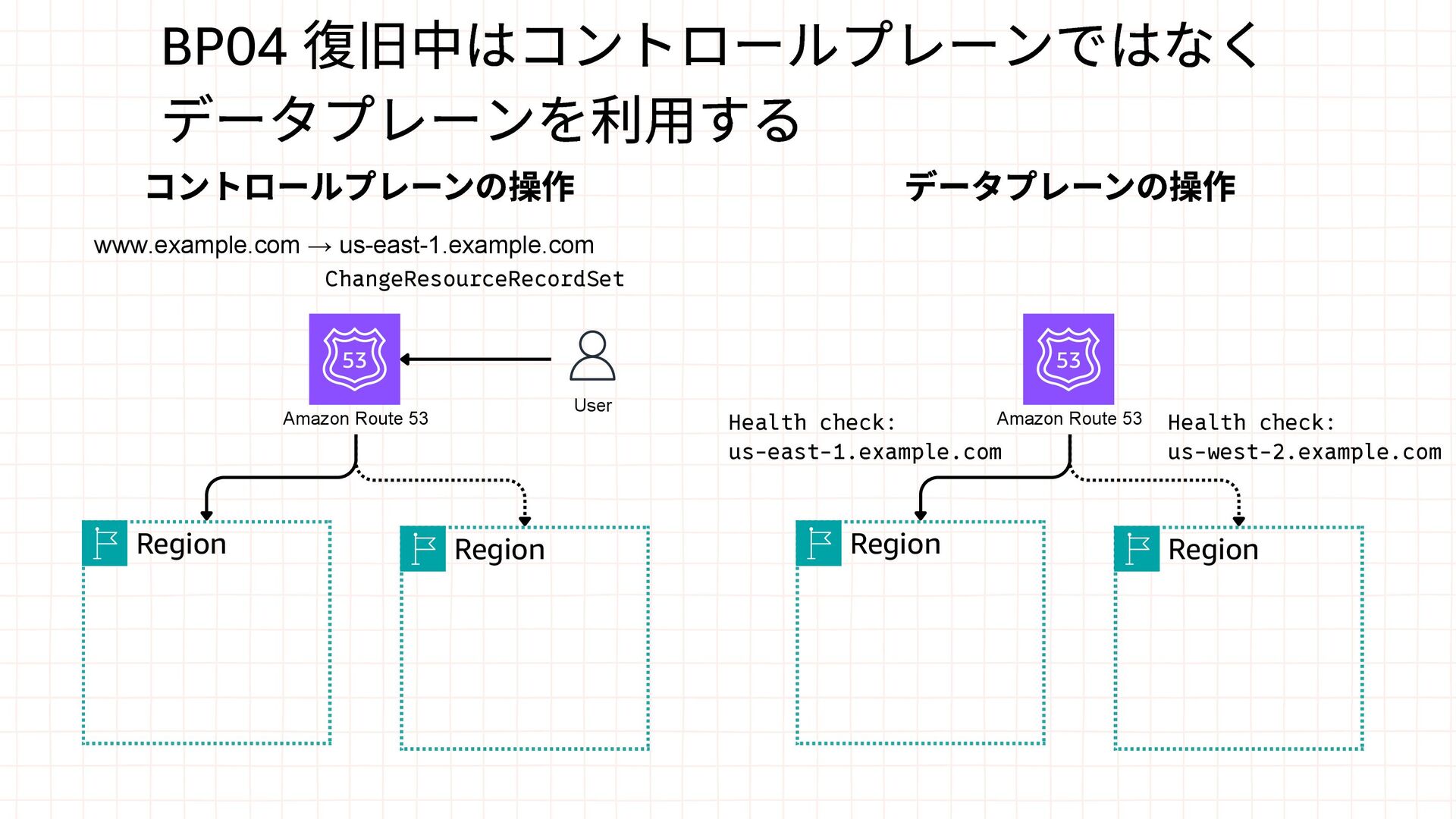 Region User ChangeResourceRecordSet Amazon Route 53 Region Region Health check: us-east-1.example.com Health check: us-west-2.example.com コントロールプレーンの操作 データプレーンの操作