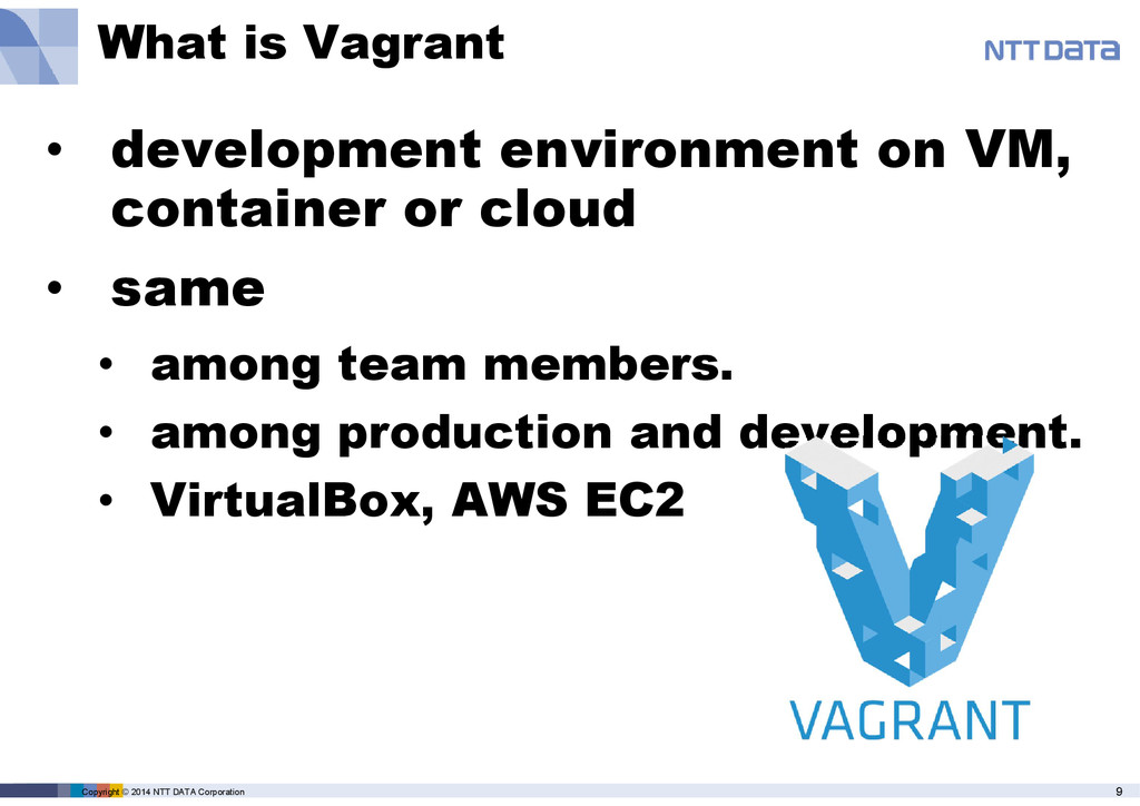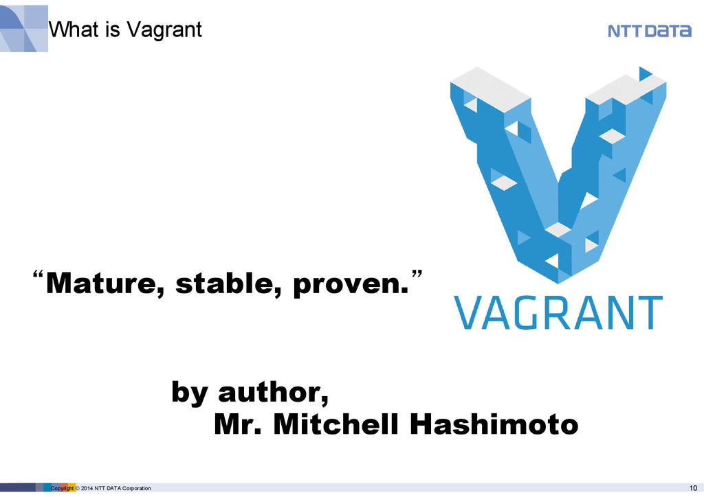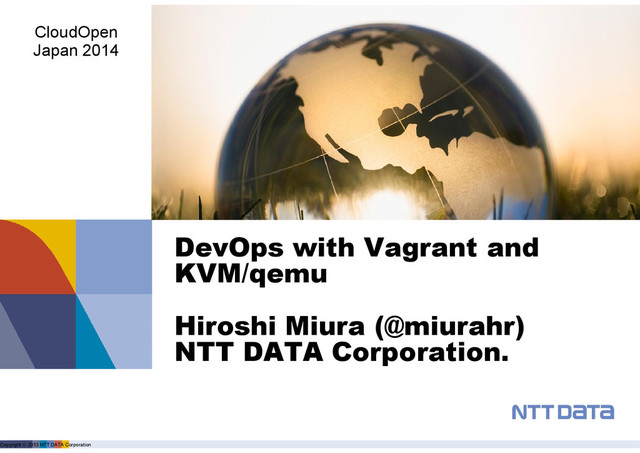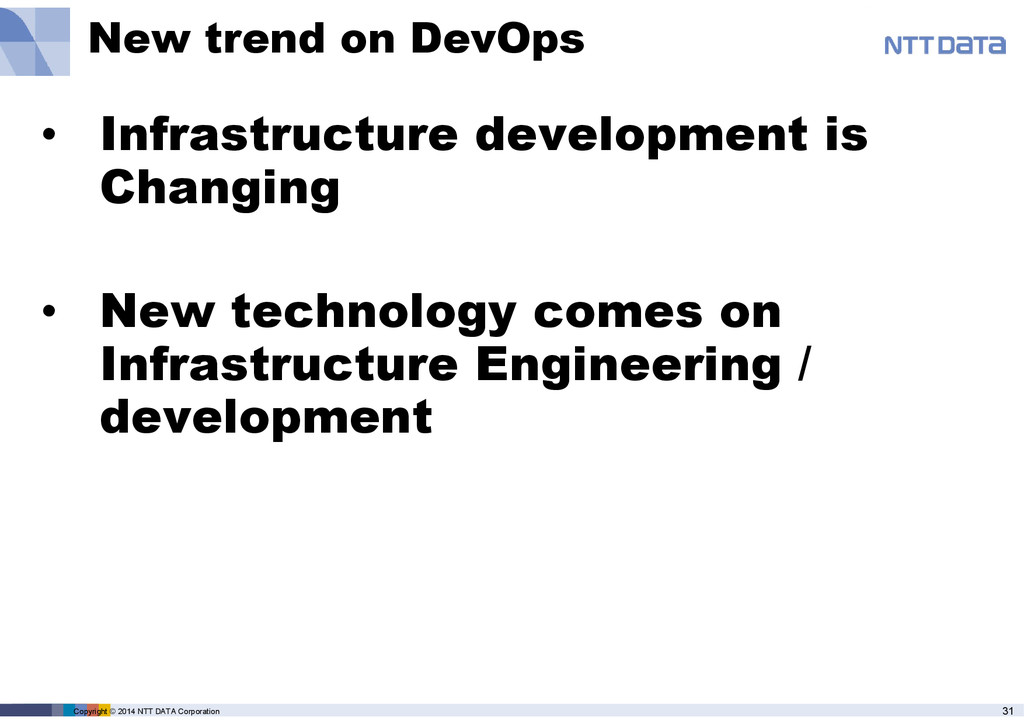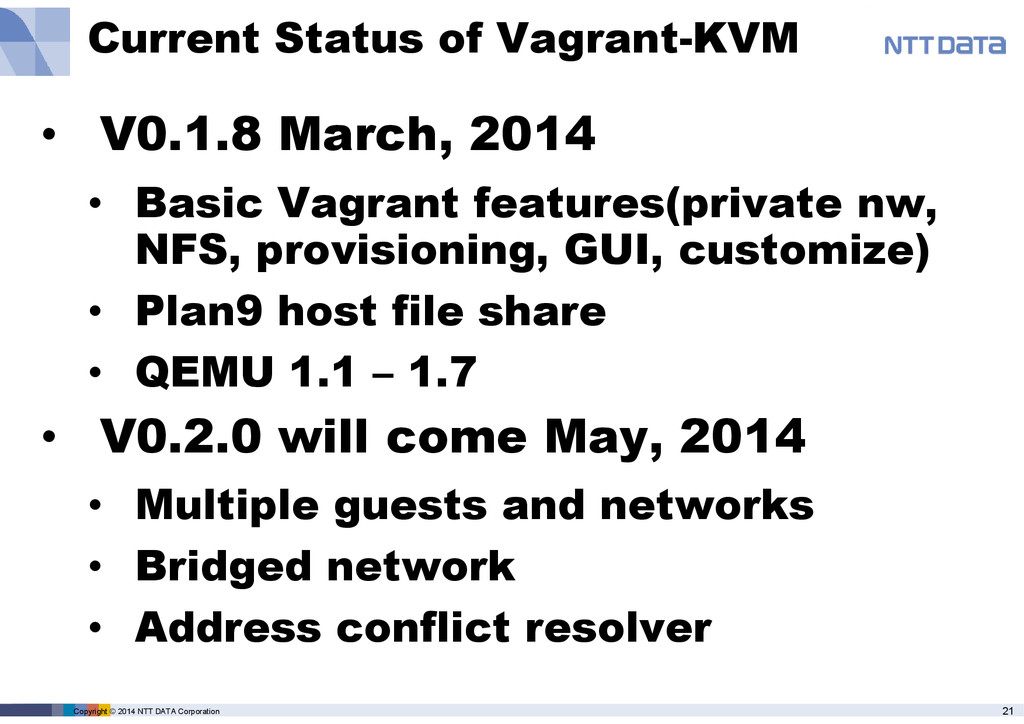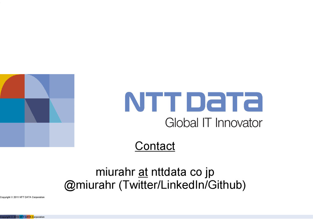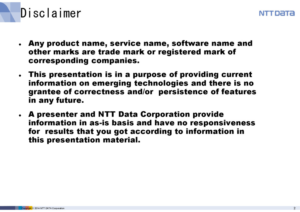 product name, service name, software name and other marks are trade mark or registered mark of corresponding companies. This presentation is in a purpose of providing current information on emerging technologies and there is no grantee of correctness and/or persistence of features in any future. A presenter and NTT Data Corporation provide information in as-is basis and have no responsiveness for results that you got according to information in this presentation material.