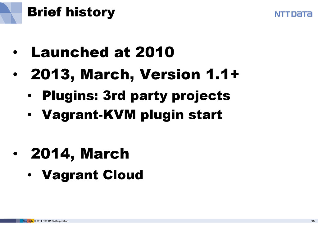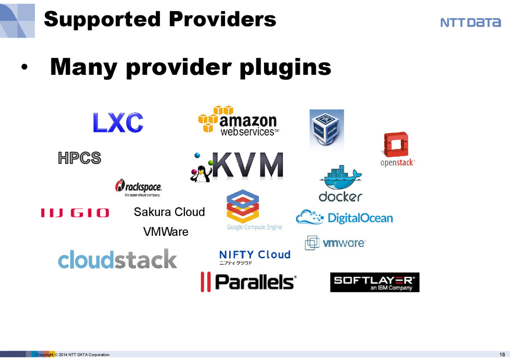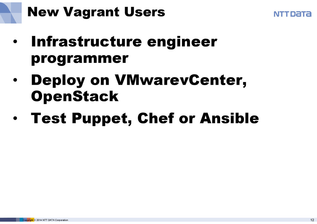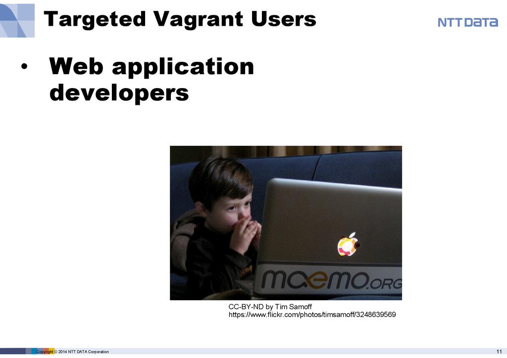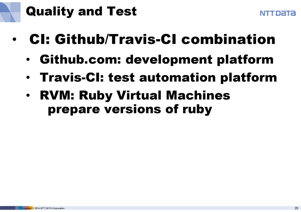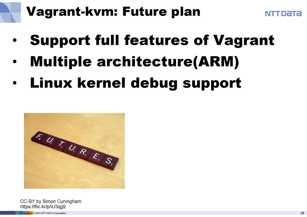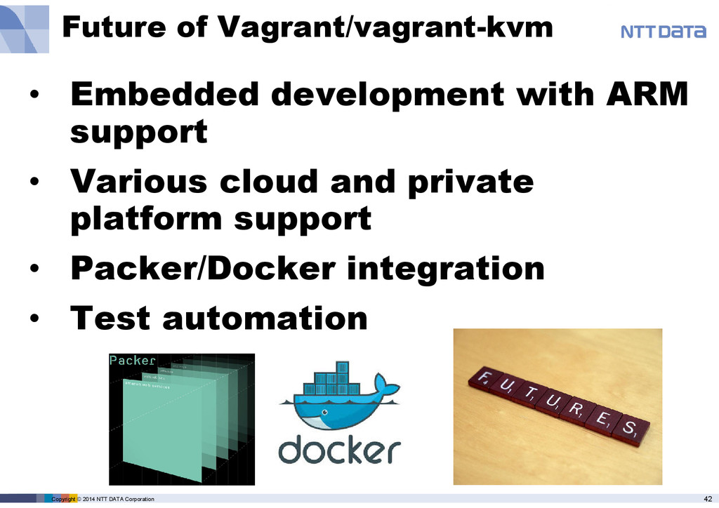 product name, service name, software name and other marks are trade mark or registered mark of corresponding companies. This presentation is in a purpose of providing current information on emerging technologies and there is no grantee of correctness and/or persistence of features in any future. A presenter and NTT Data Corporation provide information in as-is basis and have no responsiveness for results that you got according to information in this presentation material.