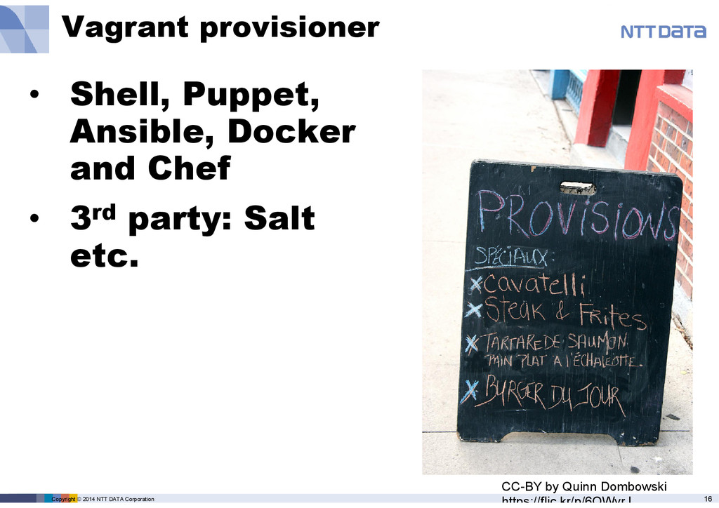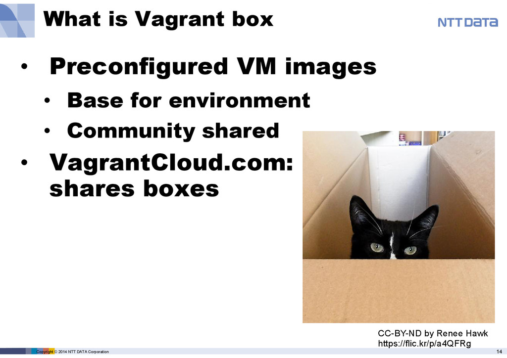 box • Preconfigured VM images • Base for environment • Community shared • VagrantCloud.com: shares boxes CC-BY-ND by Renee Hawk https://flic.kr/p/a4QFRg