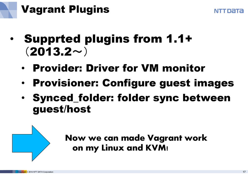 Supprted plugins from 1.1+ (2013.2〜) • Provider: Driver for VM monitor • Provisioner: Configure guest images • Synced_folder: folder sync between guest/host Now we can made Vagrant work on my Linux and KVM!