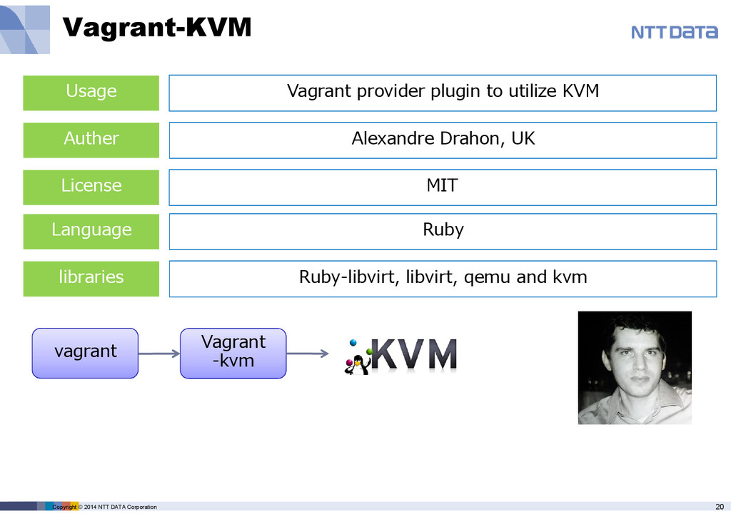 provider plugin to utilize KVM Auther Alexandre Drahon, UK License MIT Language Ruby Vagrant -kvm vagrant libraries Ruby-libvirt, libvirt, qemu and kvm