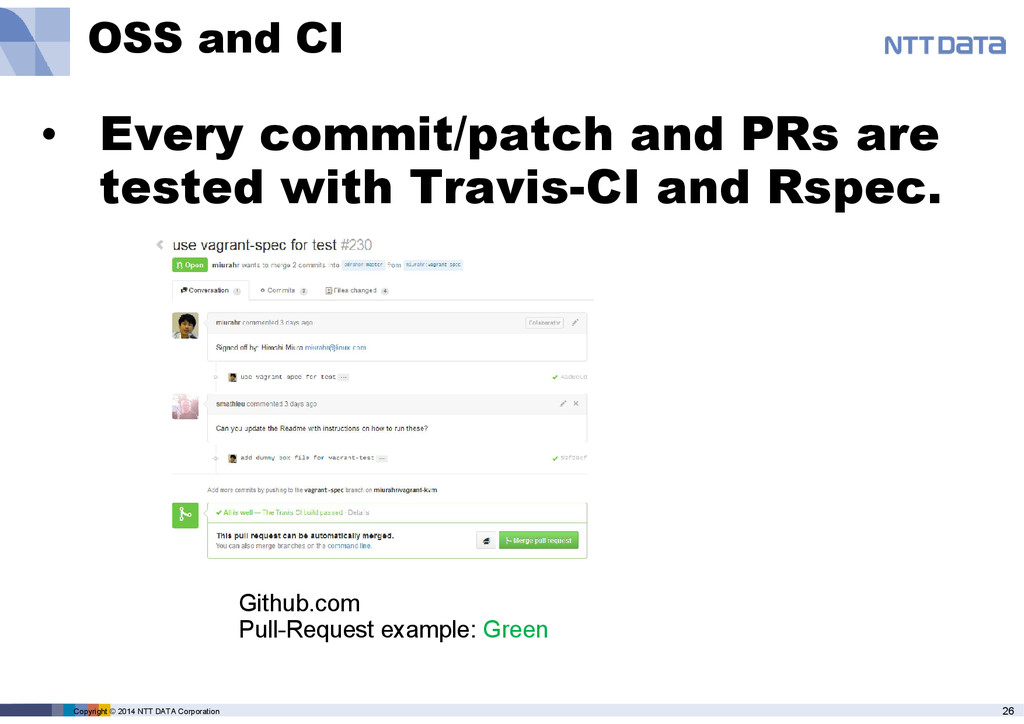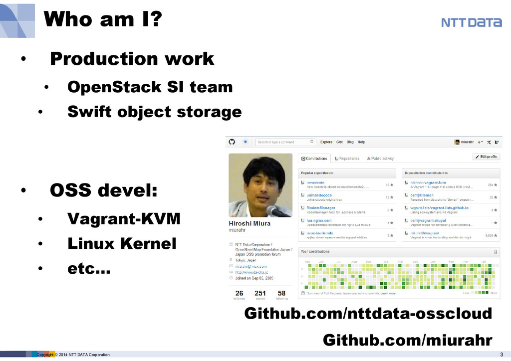Github.com/nttdata-osscloud Github.com/miurahr • Production work • OpenStack SI team • Swift object storage • OSS devel: • Vagrant-KVM • Linux Kernel • etc…