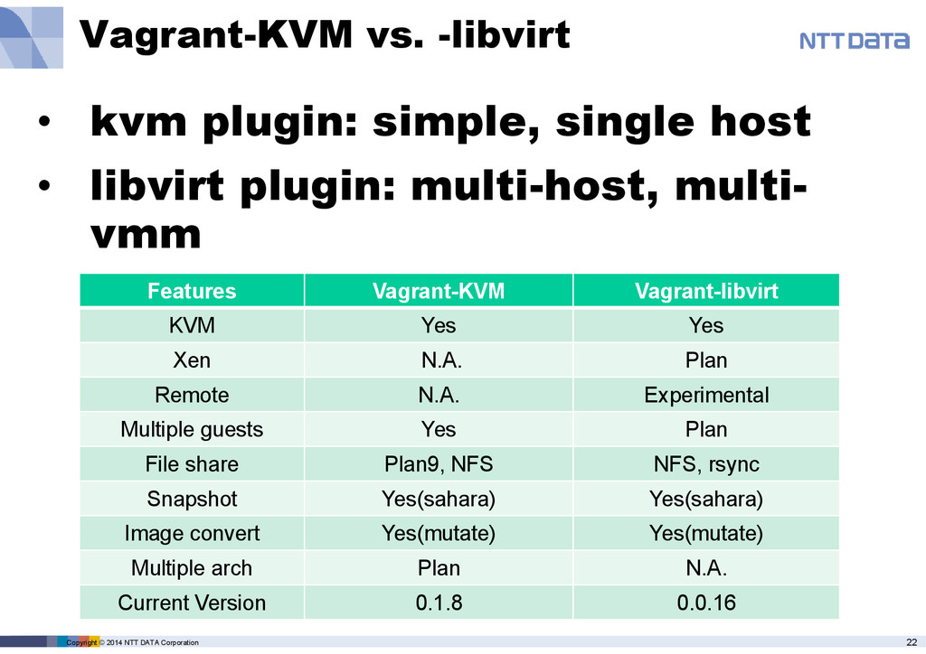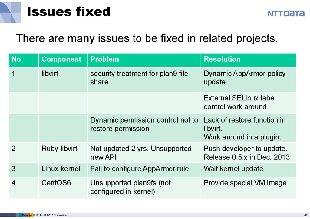 Component Problem Resolution 1 libvirt security treatment for plan9 file share Dynamic AppArmor policy update External SELinux label control work around Dynamic permission control not to restore permission Lack of restore function in libvirt. Work around in a plugin. 2 Ruby-libvirt Not updated 2 yrs. Unsupported new API Push developer to update. Release 0.5.x in Dec. 2013 3 Linux kernel Fail to configure AppArmor rule Wait kernel update 4 CentOS6 Unsupported plan9fs (not configured in kernel) Provide special VM image. There are many issues to be fixed in related projects.