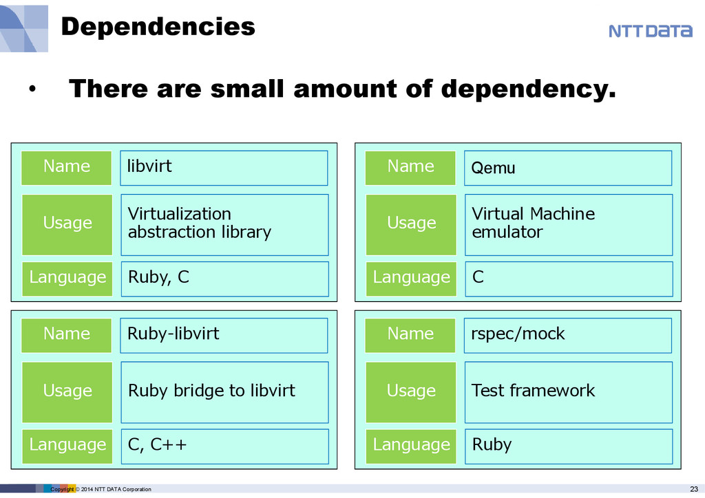 abstraction library Name libvirt Language Ruby, C Usage Ruby bridge to libvirt Name Ruby-libvirt Language C, C++ Usage Virtual Machine emulator Name Qemu Language C Usage Test framework Name rspec/mock Language Ruby • There are small amount of dependency.